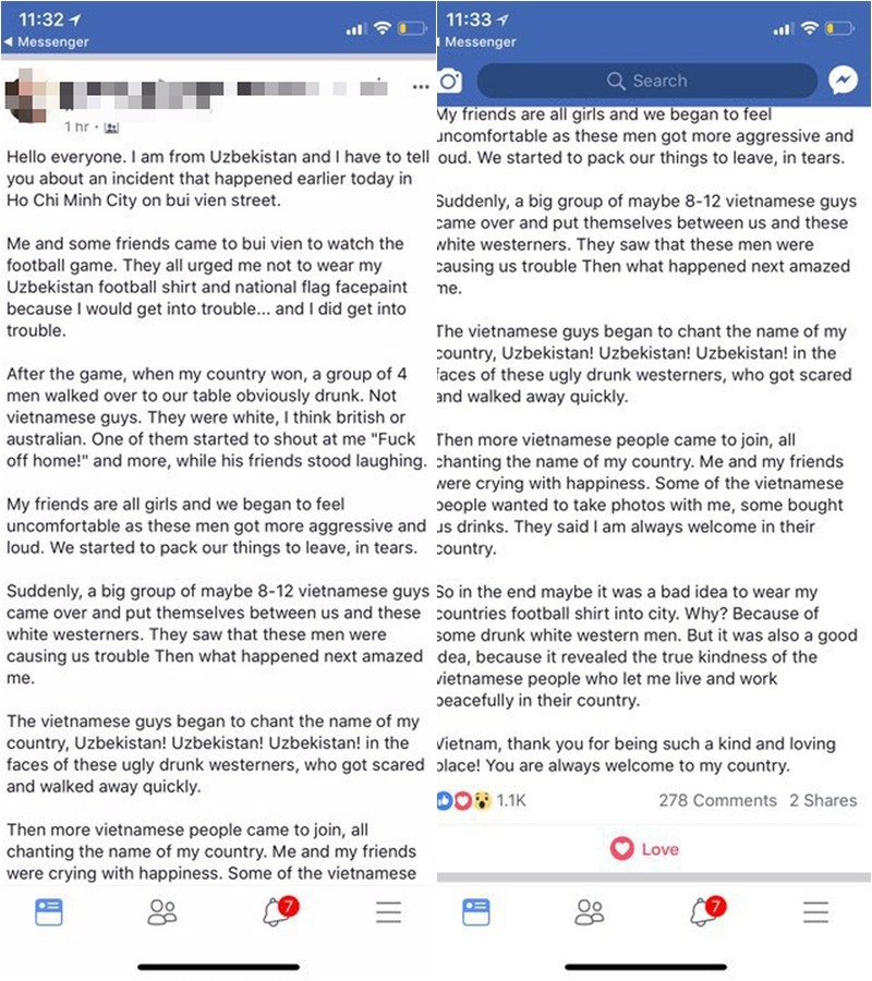 Sau khi trận đấu kết thúc với chiến thắng thuộc về Uzbekistan, mọt nhóm 4 người đàn ông bước đến bàn của chúng tôi và rõ ràng là đã say. Họ đều là người da trắng, có lẽ là người Anh hoặc Úc. Một trong số họ hét vào mặt tôi rằng: “Biến về nhà đi!” và nhiều nữa, trong khi bạn bè của anh ta thì đứng đó và cười.