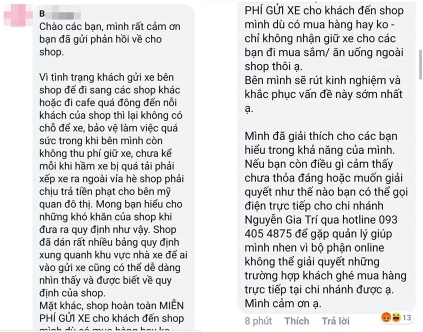 Phía cửa hàng B. sau đó đã phản hồi trên trang mạng xã hội: “Vì tình trạng khách gửi xe bên shop để đi sang các shop khác hoặc đi cafe quá đông đến nỗi khách của shop không có chỗ để xe, nhân viên bảo vệ làm việc quá sức trong khi bên mình còn không thu phí giữ xe. Chưa kể mỗi khi hầm xe bị quá tải, phải xếp xe ra ngoài vỉa hè, shop phải chịu trả tiền phạt cho bên mỹ quan đô thị”.