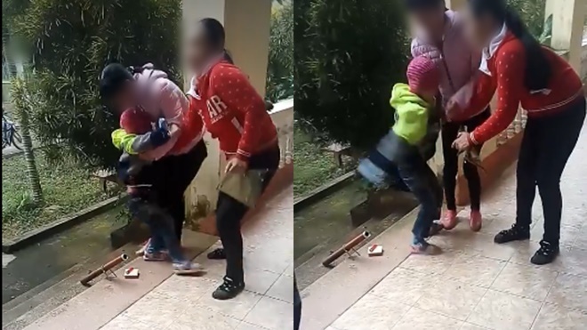 Khi người phụ nữ mặc áo đỏ lại gần, bé cứ khóc thét lên rồi ôm chặt vào người bố và xua tay đuổi đi. Ảnh cắt từ clip