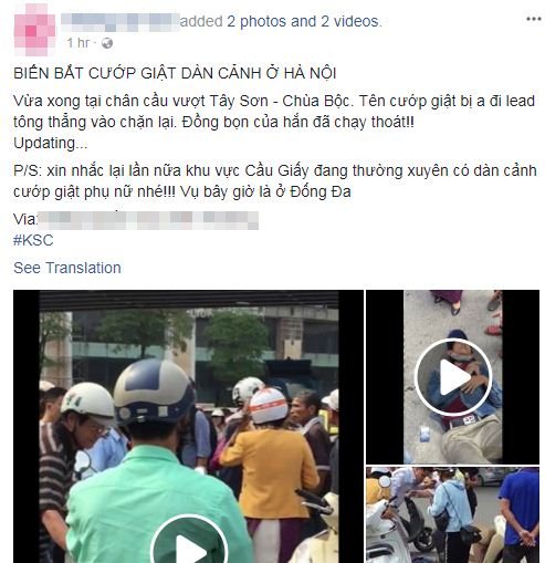 “Tên cướp bị anh đi Lead tông thẳng xe vào để chặn lại nhưng đồng bọn của hắn đã chạy thoát! Khu vực Cầu Giấy đang thường xuyên có dàn cảnh cướp giật phụ nữ nhé! Vụ bây giờ là ở Đống Đa”, một fanpage cảnh báo.