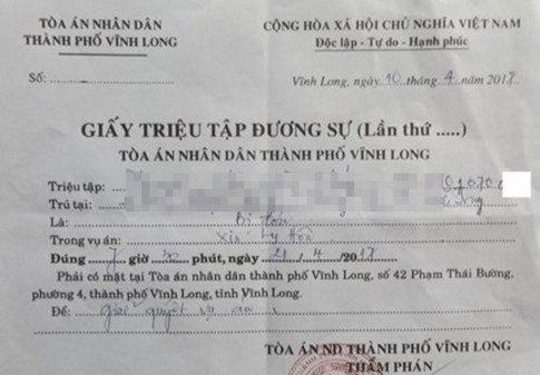 Giấy triệu tập đương sự để giải quyết ly hôn vào ngày 21.4 tới đây của TAND TP.Vĩnh Long