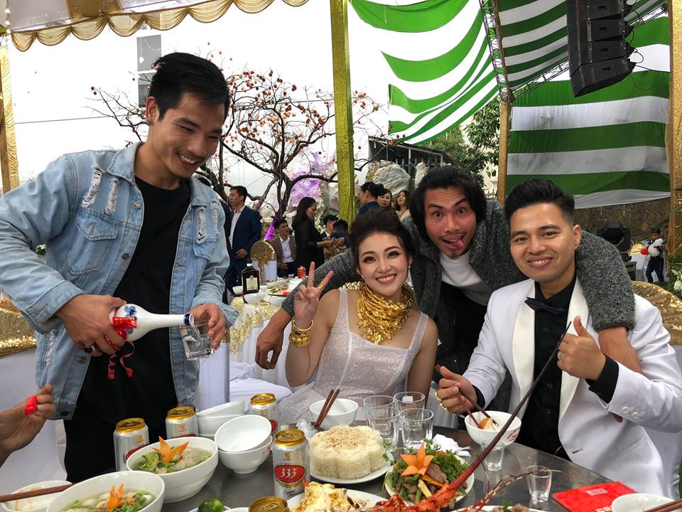 Hình ảnh cô dâu chú rể cùng bạn bè trong đám cưới. Bên mâm cỗ có tôm hùm, rượu ngoại. Facebook Sĩ Phạm