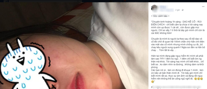 Nạn nhân viết trên trang cá nhân: “Chuyện là mình bị người lạ theo sau rồi kề dao vô cổ đòi chở đi quan hệ. Mình chần chừ thì hắn chích điện vào mặt vào cổ mình nhưng mình chống cự được, bỏ chạy kêu người xung quanh! Người ta soi đèn ra thì hắn bỏ chạy. Tóm tắt là vậy.