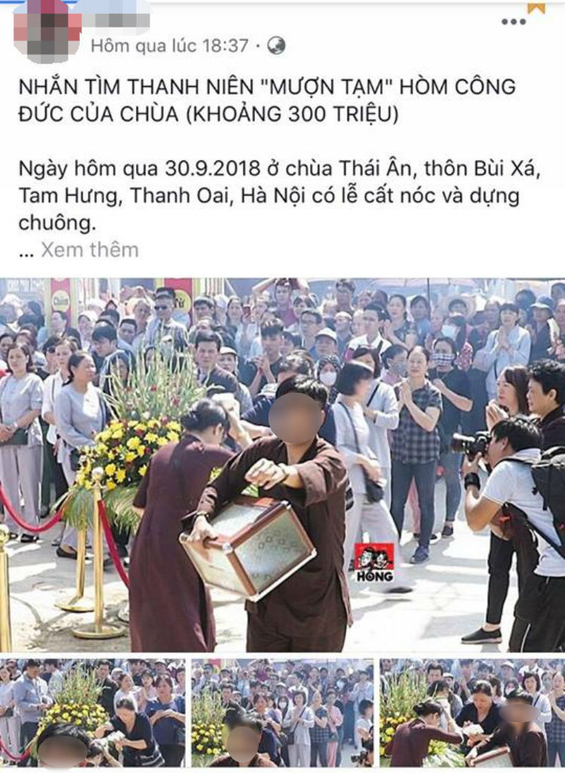 Cậu ấy chỉ đạo khách tứ phương bỏ hết tiền công đức lớn vào 1 hòm (là hòm này cậu ấy tự mang đến), còn sai cả các phật tử khênh hòm vào bên trong. Đến cuối buổi thì không thấy hòm công đức đâu, mọi người tá hỏa đi tìm, xem lại máy quay thì thấy cậu ấy đã ôm hòm công đức cất bước ra đi tự lúc nào”, thông tin chia sẻ trên mạng xã hội.