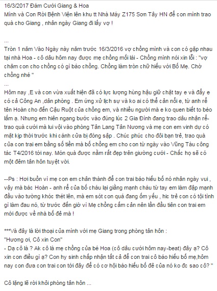 Theo như lời chia sẻ của cô gái, cô và người chồng đã sống cùng nhau và có một đứa con nhỏ, tuy vậy gia đình nhà chồng không ưng cô và bắt người chồng phải cưới một cô gái khác, để làm tròn chữ hiếu với cha mẹ, người chồng bỏ cô để về nhà cưới người vợ mới. Và ngày cưới của cả hai cuối cùng cũng đến, cô bế đứa con đến chúc phúc cho chồng thì bị gia đình nhà chồng ngăn chặn không cho vào trong, thậm chí đứa bé còn bị xô ngã đập đầu vào tường khóc thét. Món quà cưới mà cô dành tặng chồng cùng người vợ mới chính là số tiền mà bố chồng từng cho cháu nội khi cả hai còn mặn nồng bên nhau.