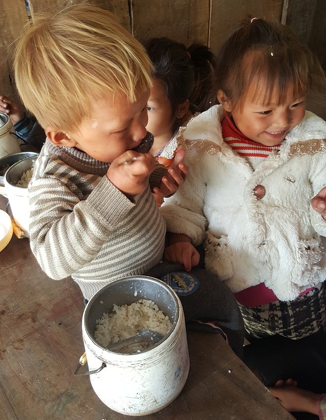 Vụ lúa thường đợi đến cuối năm mới thu hoạch. Điều ấy cũng đồng nghĩa với việc các em chỉ có cơm gạo ăn trong vài hôm nữa. Khi gạo hết, âu cơm đổi lại thành màu vàng của ngô hay mén mèn xám xịt… và vẫn tuyệt nhiên, chẳng bao giờ thêm rau xanh hay cá thịt. Thế nên, dù có ăn hết một âu cơm to đủ cho 4 người lớn ở dưới xuôi nhưng những đứa trẻ chỉ bé như con mèo nhỏ ở nơi này vẫn luôn thấy bụng dạ đói cồn cào.