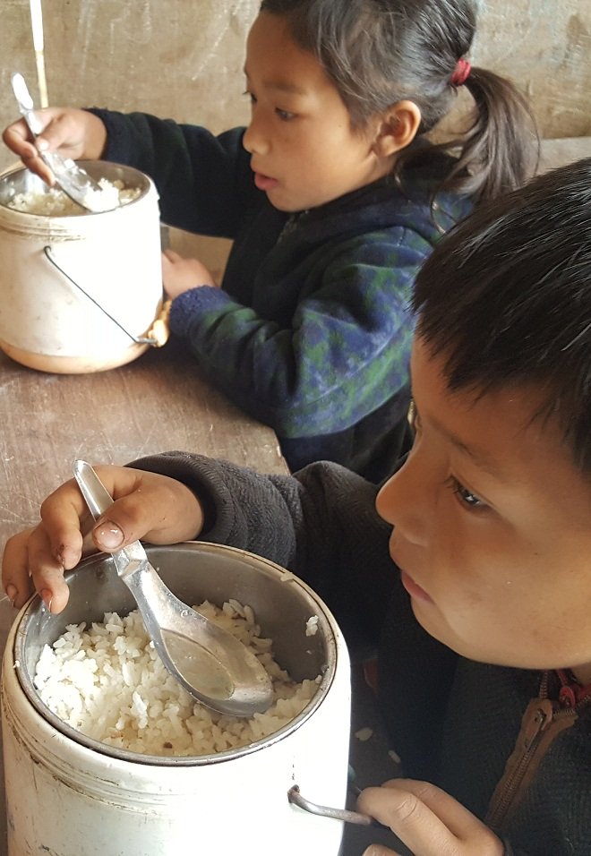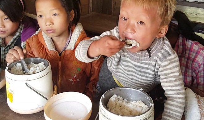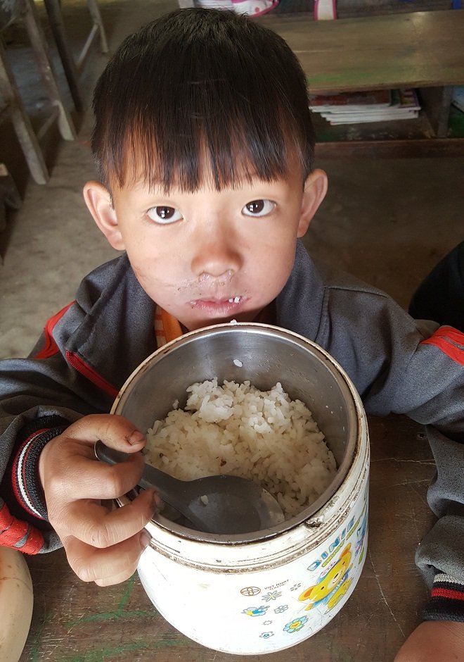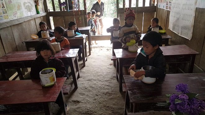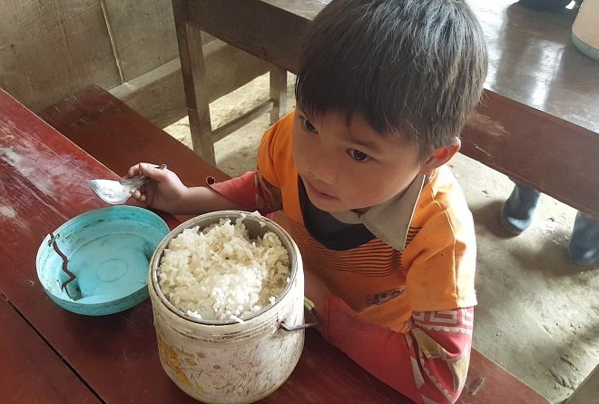 Đúng 11h30 trưa, khi các cô thông báo đến giờ ăn, cả lớp hào hứng nghỉ ngơi, đem cặp lồng cơm sang phòng bên cạnh. Cứ ngỡ rằng âu cơm đó chắc phải hấp dẫn, thơm ngon với nhiều rau xanh, thịt cá nên các em mới cao hứng đến thế nhưng hóa ra, khỉ lật mở chỉ thấy duy nhất một màu trắng lạnh lẽo của cơm gạo, vàng nhạt của mèn mén ngô xay, hay ngà ngà của gạo trộn mèn mén. Trên nắp âu cơm có nhúm màu đen, trông như thịt xay. Tuy nhiên, cô giáo bảo, đó là đậu tương thối đem rang. Cả điểm trường với mấy chục học sinh, tuyệt nhiên không có miếng thịt nào.