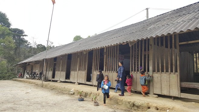 Khó khăn không chỉ vì đường đi mà còn bởi điều kiện học tập cũng vô cùng tạm bợ. Trường học chỉ là một dãy nhà gỗ dài hơn 20m, chia thành những phòng nhỏ lợp mái phibro ximăng, với những thanh gỗ lắp ghép gió lùa lạnh cóng. Phía dưới là một căn nhà gỗ nữa, ngăn đôi, là điểm trường mầm non, nhưng một phòng đóng cửa, vì học sinh không chịu đến lớp.