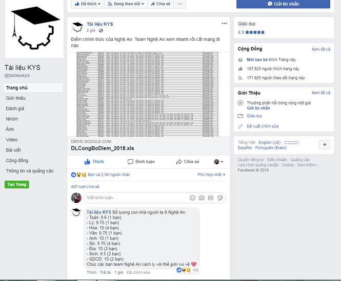 Trước đó, trên một số trang mạng xã hội lan truyền dữ liệu điểm thi THPT quốc gia năm 2018 của học sinh tại cụm thi Nghệ An. Một số thí sinh đã tra cứu và biết được điểm thi của mình.