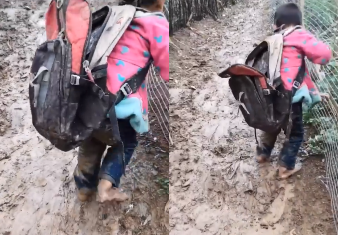 Theo đoạn clip ghi lại, 1 bé trai ăn với đầu trần chân đất, chiếc balo cũ kĩ, thậm chí có phần rách nát được em đeo trên lưng. Đáng chú ý là hình ảnh bé trai này loay hoay, cố gắng nhấc từng bước chân đi trên con đường trơn trượt, đầy bùn lầy. Tay bé trai phải nắm vào hàng rào để bước đi, vậy nhưng đường quá trơn khiến em thi thoảng vẫn trượt ngã.