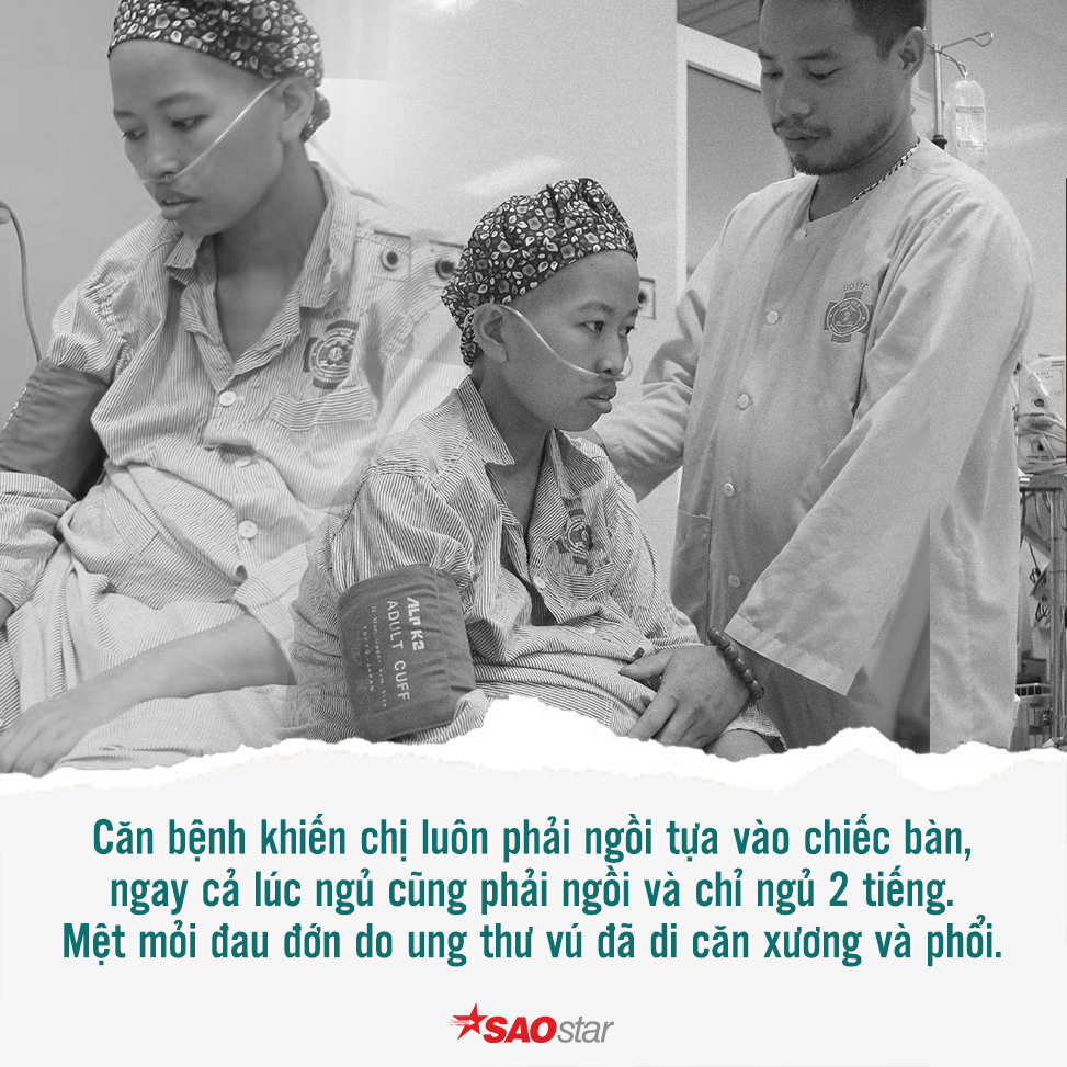 “Tất cả mọi sinh hoạt, ăn uống, vệ sinh của vợ tôi đều phải có sự trợ giúp của người thân. Không chỉ thế, căn bệnh cũng khiến vợ tôi phải ngồi tựa vào chiếc bàn, ngay cả lúc ngủ cũng phải ngồi để ngủ chứ không thể nằm xuống như người bình thường được, mỗi ngày chỉ ngủ 2 tiếng, mệt mỏi đau đớn do ung thư vú đã di căn xương, phổi… ”, anh Hùng tâm sự.