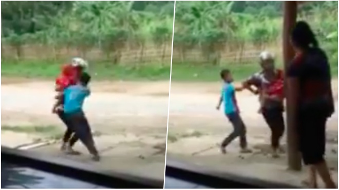 Dù người mẹ đang bế em gái nhỏ trên tay, nhưng vì bực tức không được mua điện thoại theo ý mình, đứa con bất hiếu này sẵn sàng xô ngã mẹ. Đáng phẫn nộ hơn, cậu ta còn lớn tiếng nói: “Tí về bố chém chết mẹ luôn.” Và trước đó còn cầm gạch định tấn công mẹ.