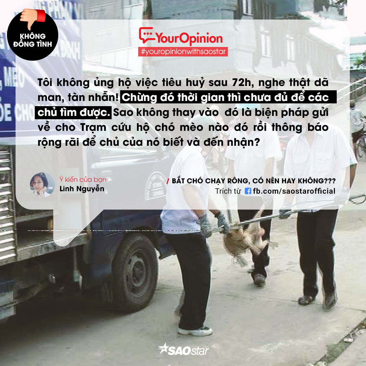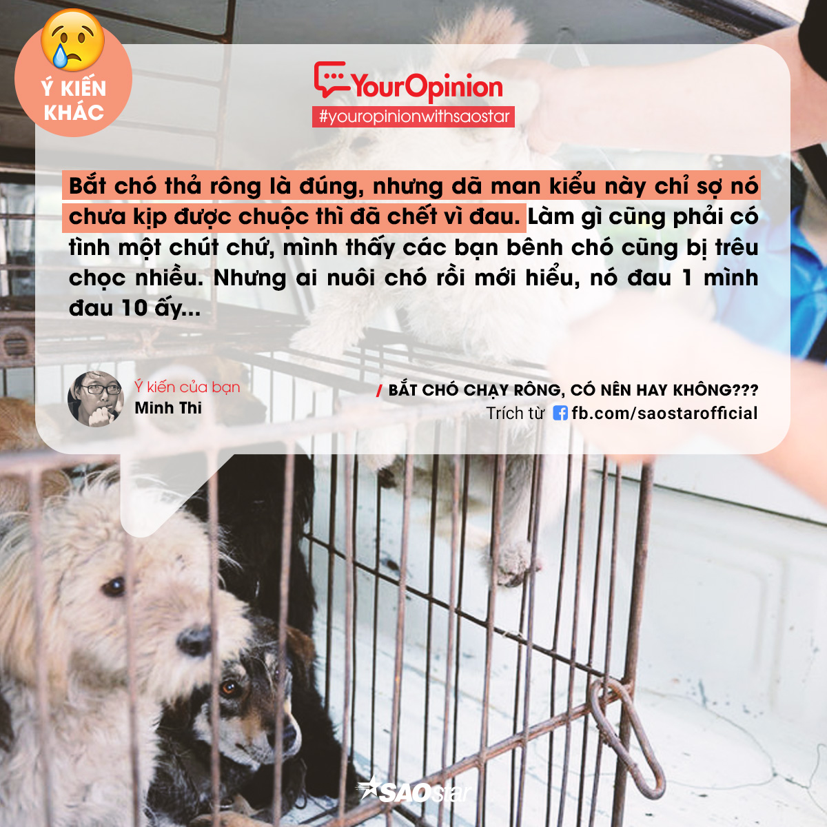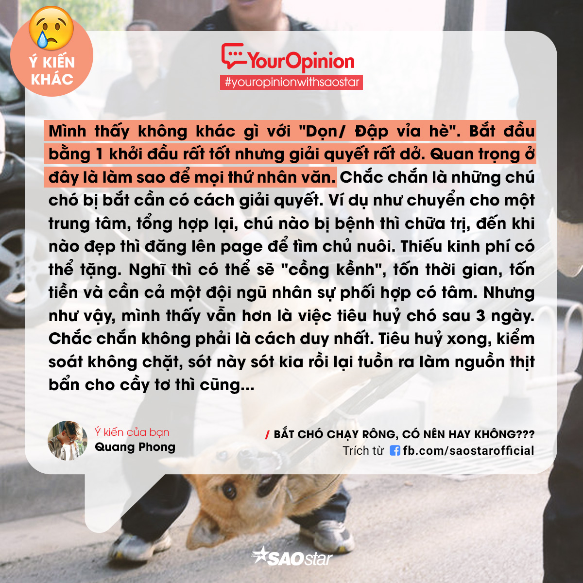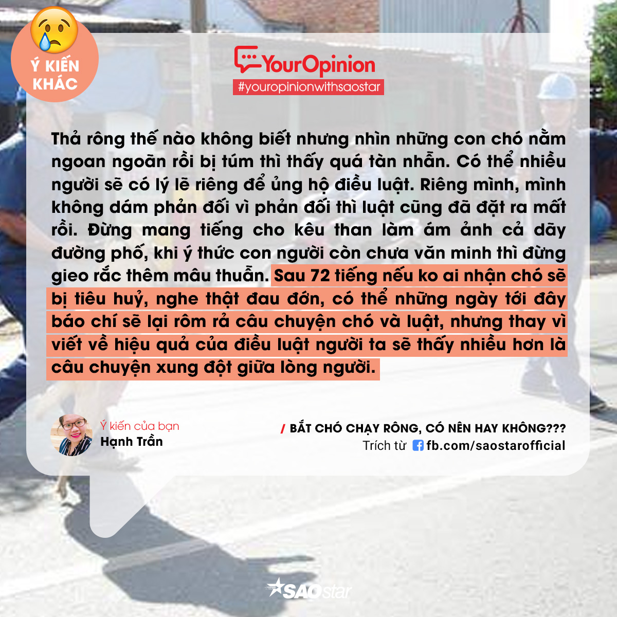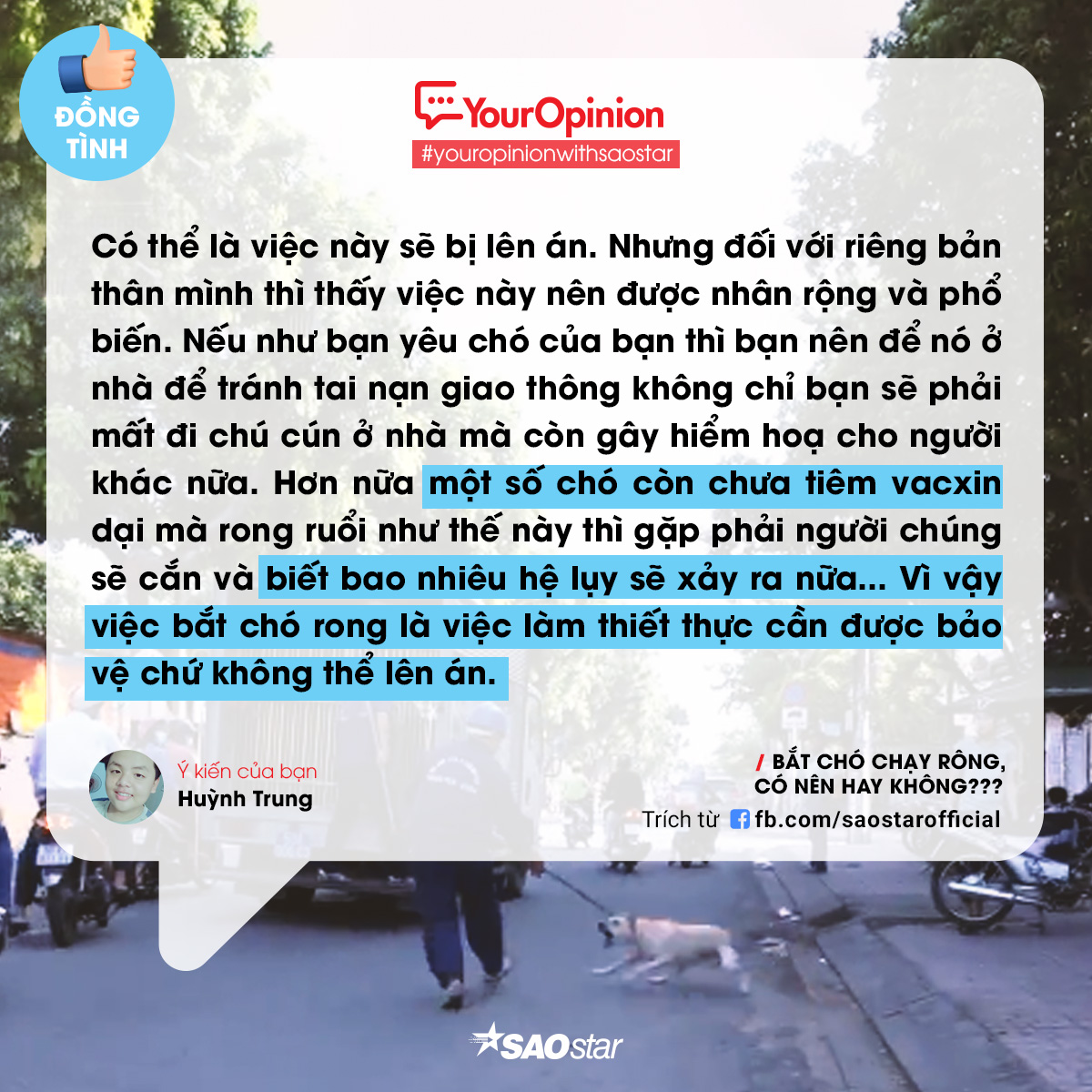 ???????????? BẮT CHÓ CHẠY RÔNG, CÓ NÊN HAY KHÔNG???????????Nhằm dứt điểm những ảnh hưởng tiêu cực đến vệ sinh chung, an toàn giao thông và môi trường sống, Đội bắt chó thả rông tại các Chi cục thú y TP.HCM được thành lập để thực thi biện pháp mạnh: Ràng bắt trực tiếp những chú chó #chạy_rông ngoài đường, thậm chí ngay trước mặt chủ. Sự ra quân, hành động quyết liệt này gây ra nhiều tranh cãi, nhất là đối với những “tín đồ” yêu động vật. Bạn có đồng tình với hướng giải quyết “đanh thép” trên? Hãy chia sẻ cùng SAOStar #saostarYourOpinion_4 nhé!---#YOUR_OPINION là định dạng nội dung mới và khác biệt của SaoStar, lần đầu xuất hiện trên thị trường báo chí. Đây là kênh thông tin “hai chiều” hữu hiệu để SAOStar kết nối nhanh chóng và hiệu quả với độc giả. Như đúng tên gọi YOUR OPINION, độc giả chính là “nhân vật trọng tâm” mà SAOStar mong muốn được lắng nghe ý kiến của các bạn đánh giá về những “điểm nóng” gây tranh cãi, thuộc khắp lĩnh vực: xã hội, giải trí, đời sống và thể thao. Tất cả những ý kiến, quan điểm độc đáo, có giá trị với giới trẻ và xã hội, chúng tớ sẽ ghi nhận và design thật "lung linh" để đăng tải lên tạp chí điện tử SAOStar.Các bạn hãy hỗ trợ, đồng hành cùng SAOStar đưa ra những quan điểm thật phù hợp, bổ ích. Những ý kiến của các bạn là những góc nhìn đa màu đa diện góp phần quan trọng để định hướng và xây dựng văn hóa ứng xử trong giới trẻ Việt Nam, từ cả lời nói lẫn hành động của mình.Hãy cùng chung tay với SAOStar để hướng đến một xã hội tốt đẹp, văn minh và yêu thương nhau hơn, các bạn nhé! ❤#youropinionwithsaostar