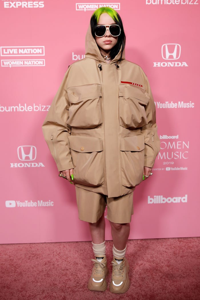 Eilish tiếp tục nắm bắt xu hướng màu sắc trung tính tại sự kiện Billboard Women in Music 2019. Cô mặc quần áo chất liệu kaki từ đầu đến chân, giày thể thao quen thuộc và kính râm Gucci.