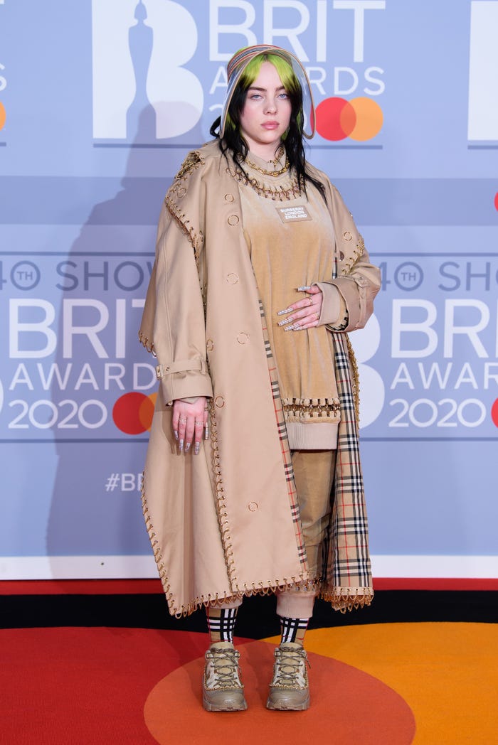Lại một lần nữa, Eilish mặc Burberry từ đầu đến chân cùng một chiếc mũ ca-pô đến lễ trao giải BRIT. Cách kết hợp này làm chúng ta liên tưởng đến Eilish khi tham dự American Music Awards 2019.