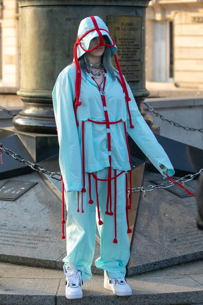 Trong Tuần lễ thời trang Paris năm 2019, Eilish tạo dáng chụp ảnh trong bộ đồ hai mảnh màu pastel với phần đầu được làm từ dây thừng màu đỏ. Cô nàng kết hợp trang phục của mình với giày thể thao Nike Air Force 1 màu trắng.