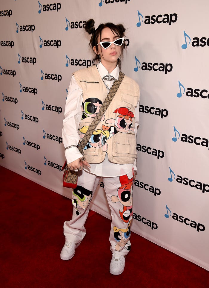 Tại lễ trao giải âm nhạc pop ASCAP 2019, Eilish tiếp tục nhờ đến tài năng vẽ hoạt hình của nghệ sĩ SlumpyKev. Cô mặc hộp vẽ hình ‘Powerpuff Girls’ với quần kaki cùng màu. Phụ kiện đi kèm là ‘túi đưa thư’ Gucci và kính râm màu trắng.