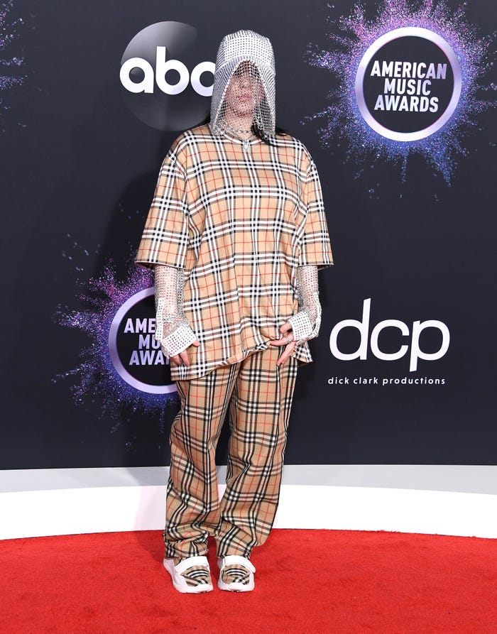 Tại lễ trao giải American Music Awards 2019, Eilish mặc một cây Burberry từ áo, quần đến giày, tất nhiên khuôn mặt cô nàng tiếp tục được che kín.