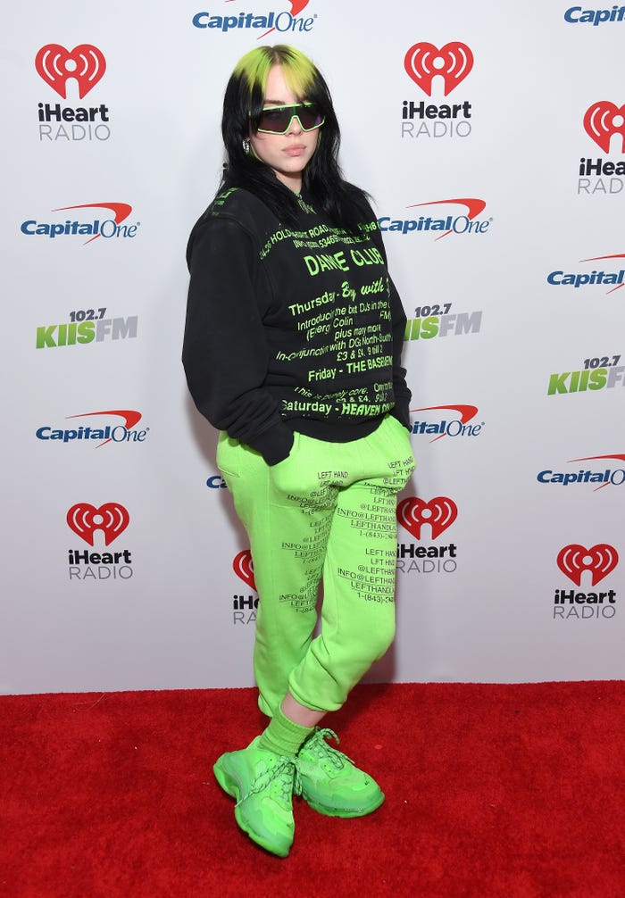 Eilish nổi bần bật trong màu xanh neon tại Jingle Ball của KIIS FM năm 2019. Cô mặc một chiếc áo hoodie MISBHV màu đen, quần Lefthandla màu xanh lá cây, tất ASOS cungx màu xanh lá cây và giày thể thao Balenciaga. Lần này nữ ca sĩ che mặt bằng chiếc kính râm Prada có viền màu xanh.