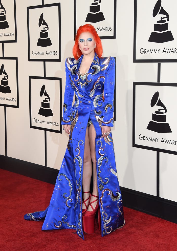 Câu chuyện khác hẳn khi cô trở về với các giải thưởng âm nhạc. Tại Grammy 2016, Gaga bất ngờ xuất hiện trong mái tóc màu cam neon và chiếc váy ánh kim thêu tay chi tiết. Tất nhiên đôi giày cao gót đóng cộp thương hiệu Lady Gaga cũng có mặt.