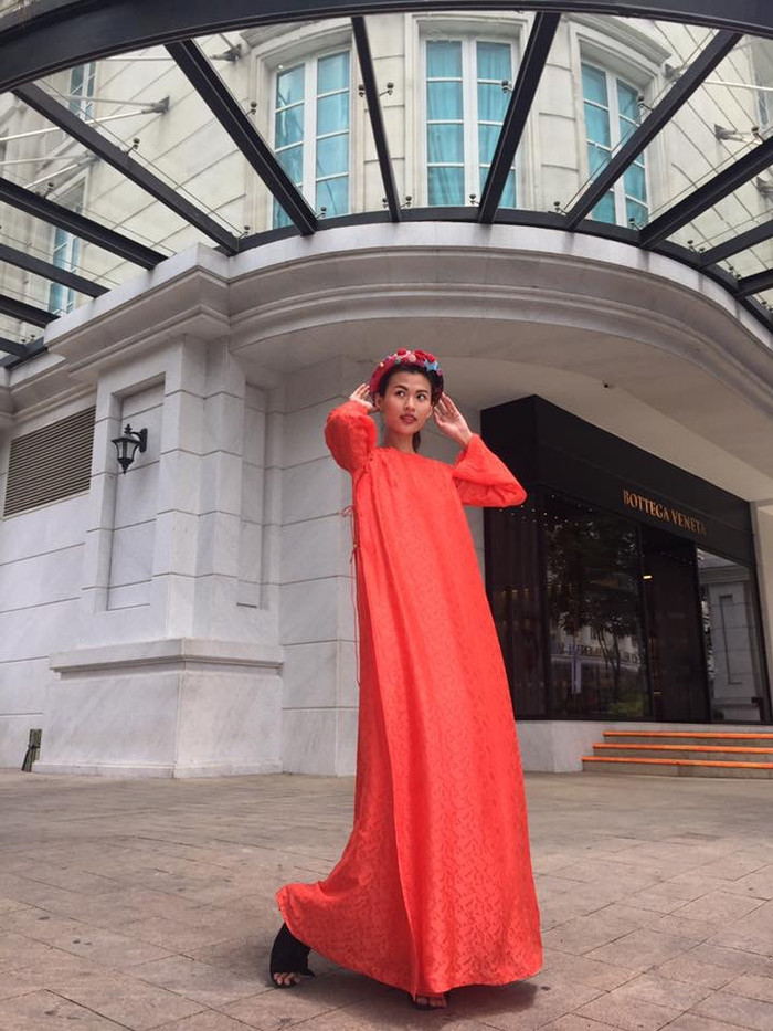 Cao Thiên Trang xuất hiện trên đường phố Sài Gòn với trang phục bay bổng từ NTK Thuỷ Nguyễn kết hợp cùng mấn đội đầu thêu hoa.