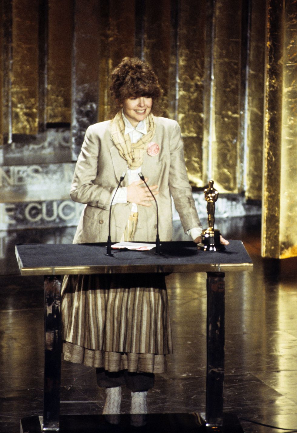 Không giống với các diễn viên khác, Diane Keaton mặc áo blazer với chân váy đến lễ trao giải Oscar. Vai diễn trong phim ‘Annie Hall’ đã mang về cho cô một chiếc tượng ‘Nữ diễn viên xuất sắc nhất’.