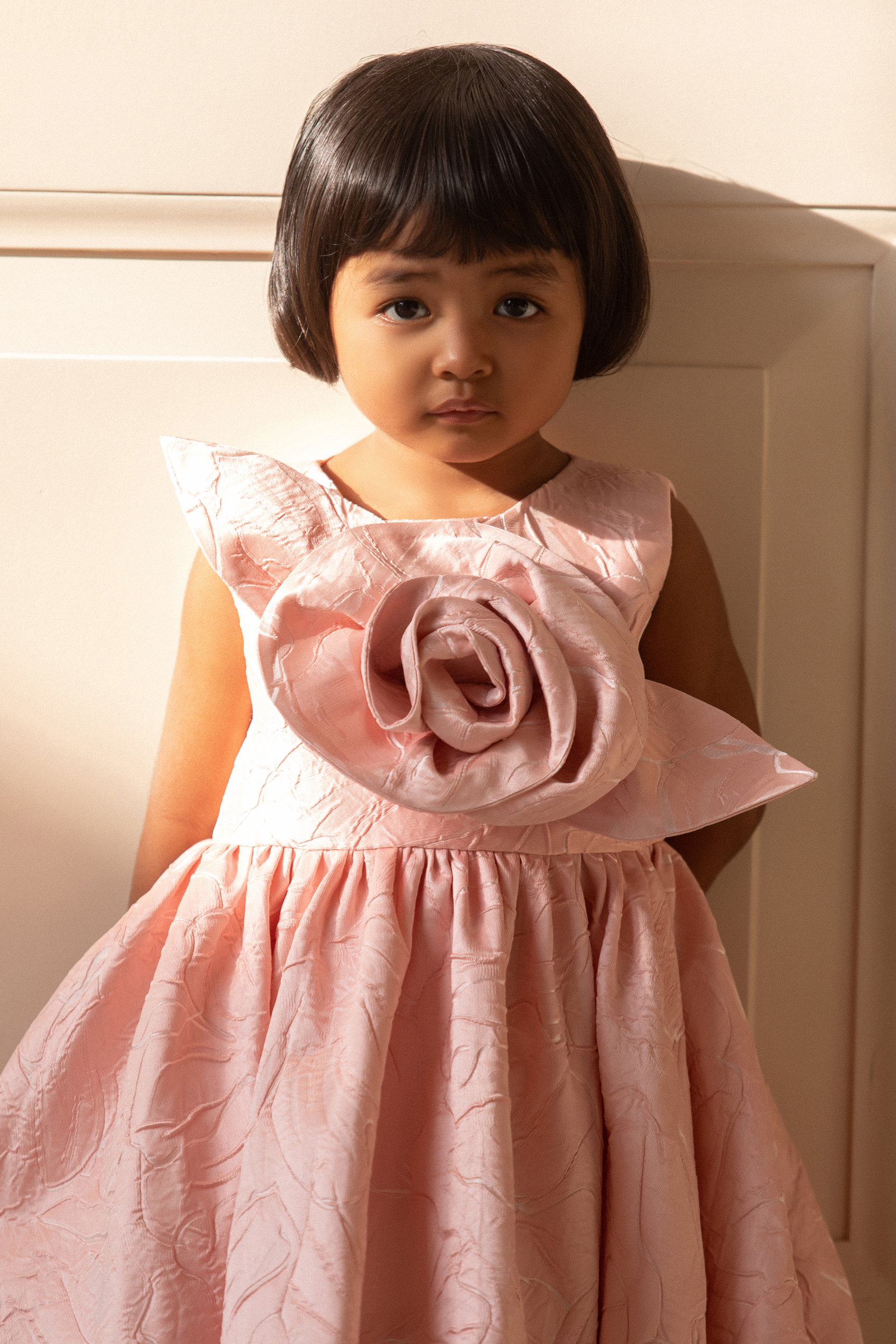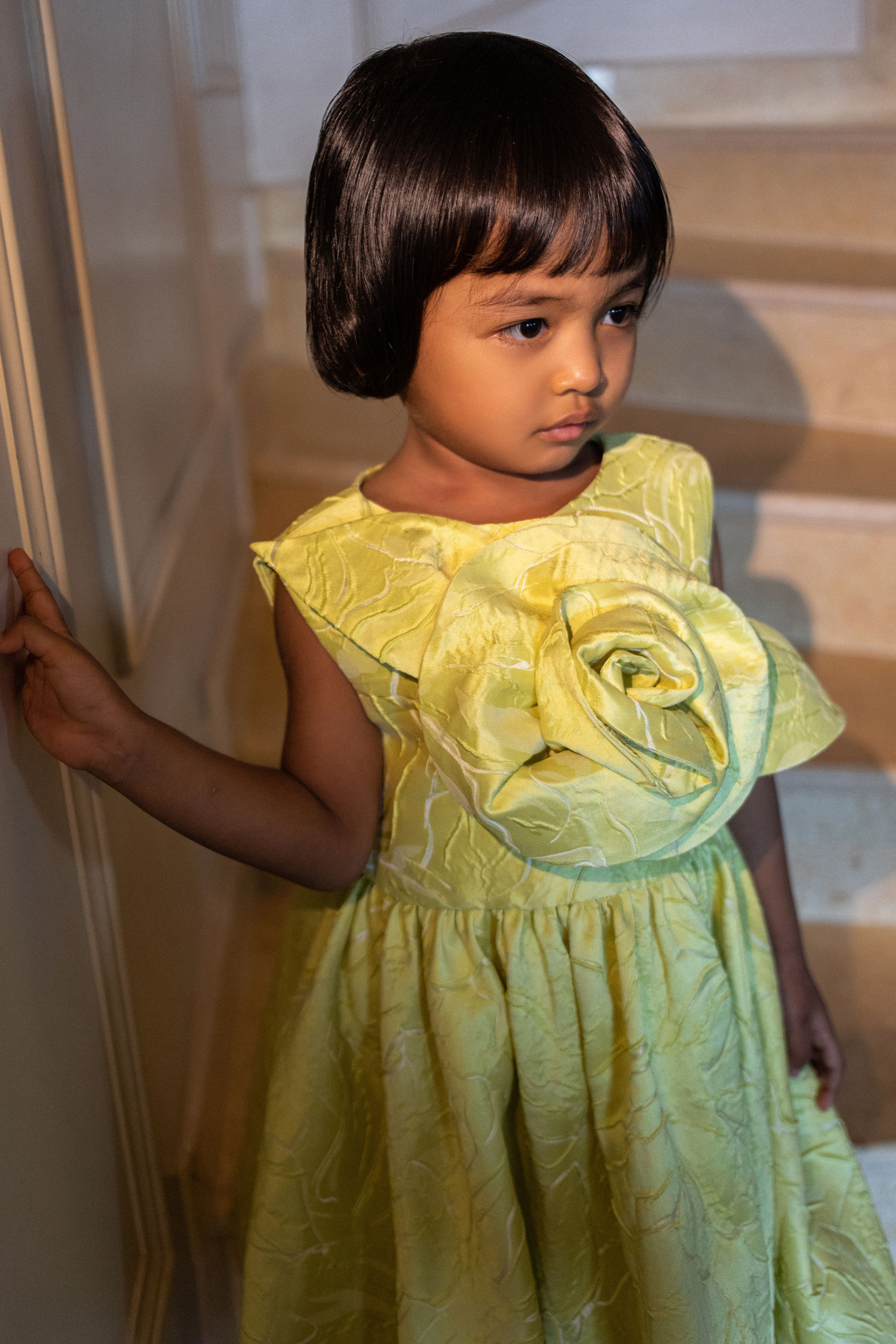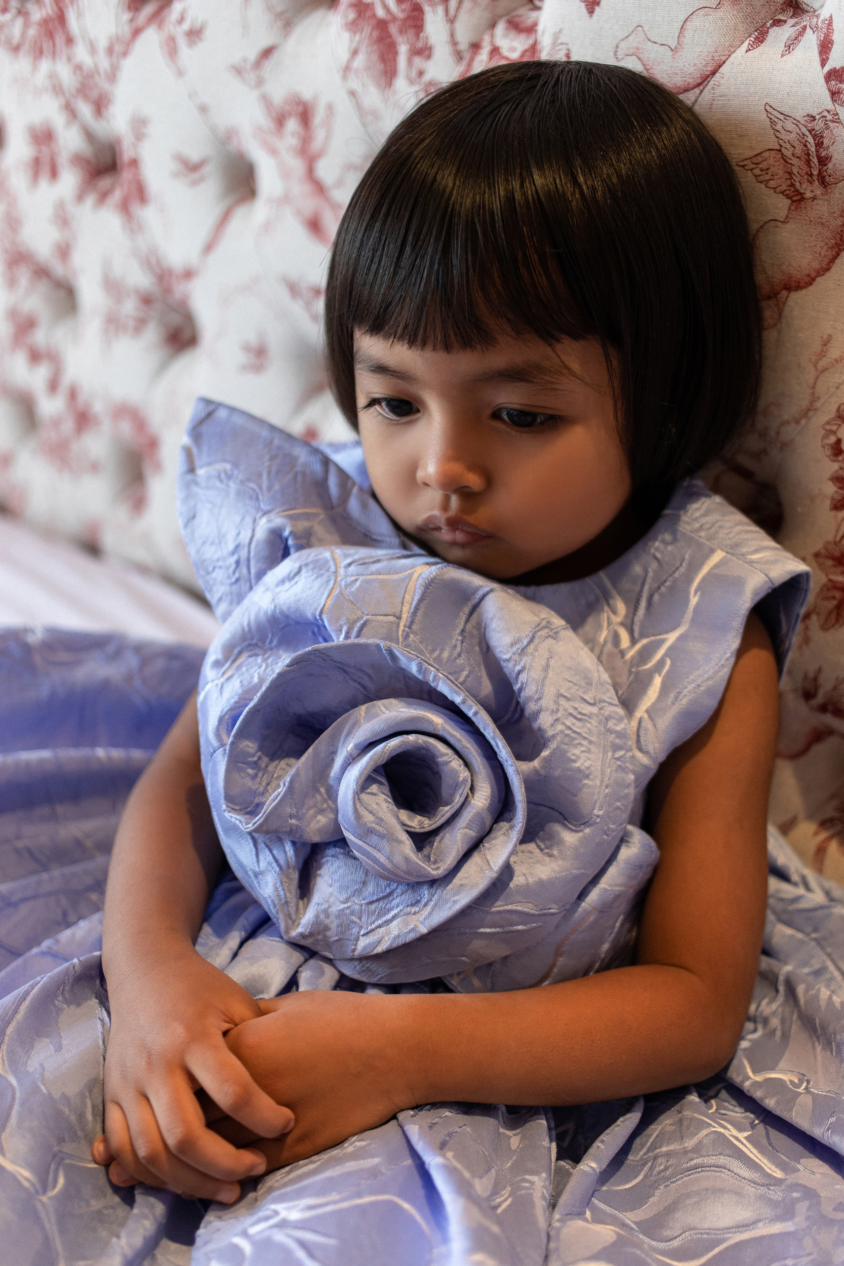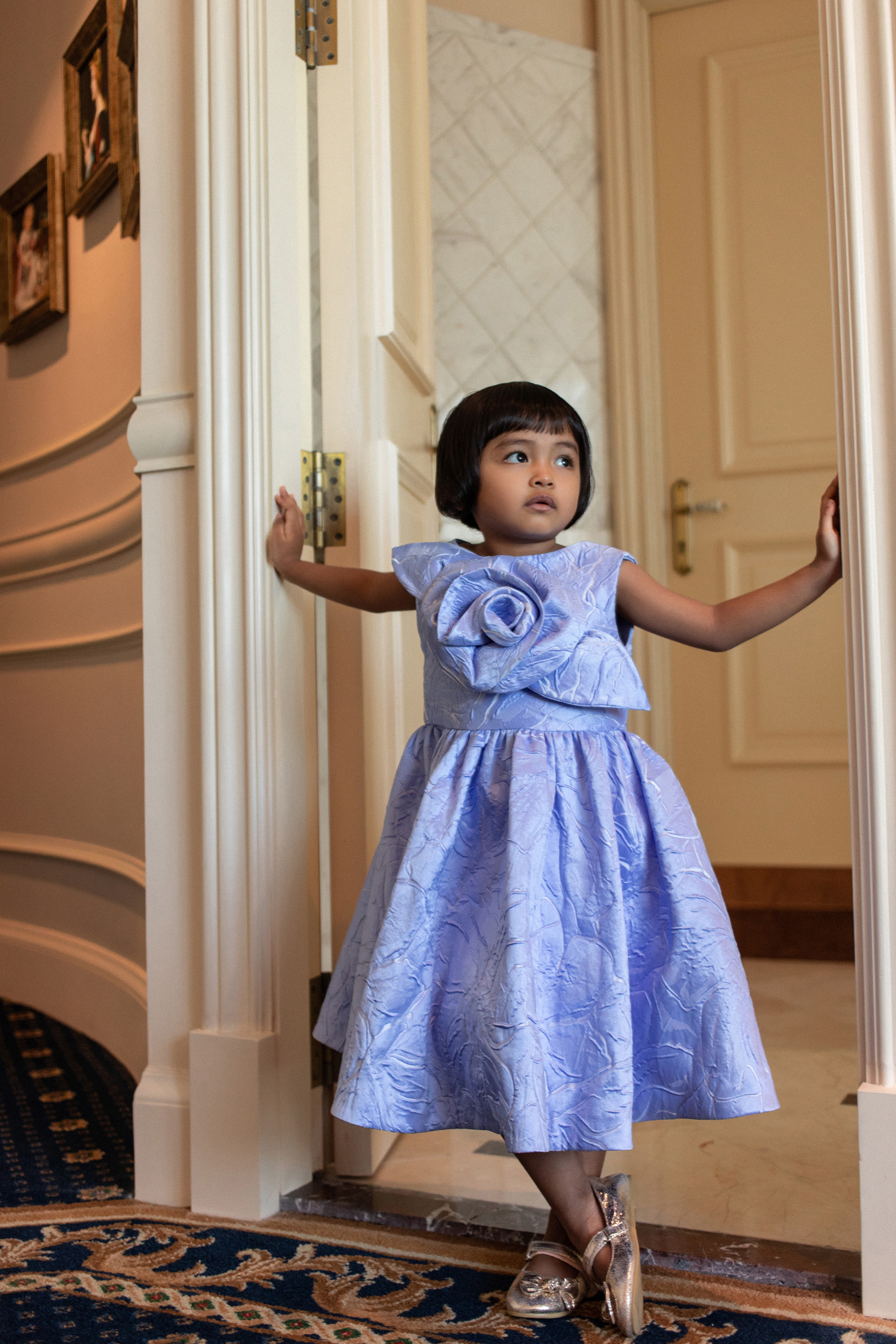 Mới đây, NTK dành tặng cho con gái 6 chiếc váy mới toanh khi chuẩn bị vào hè. Trang phục lấy phom xoè làm chủ đạo, mang đến cảm giác thoải mái. Phần thân váy được tạo điểm nhấn với chi tiết hoa hồng 3D to bản. Nên vải với những hoạ tiết in chìm dập nổi càng giúp mẫu váy thêm phần đặc biệt.