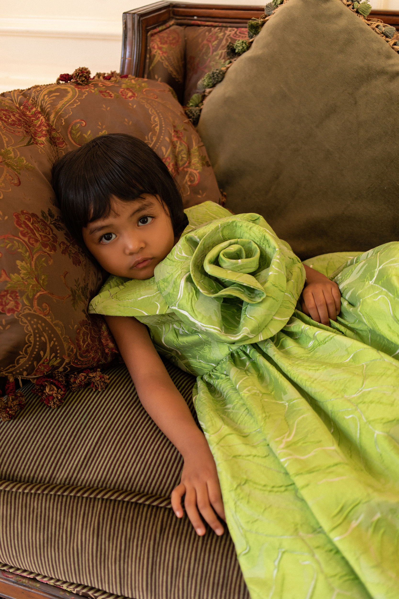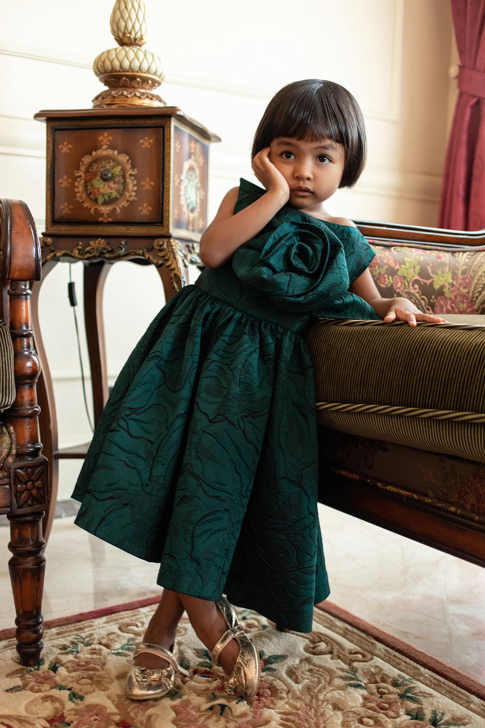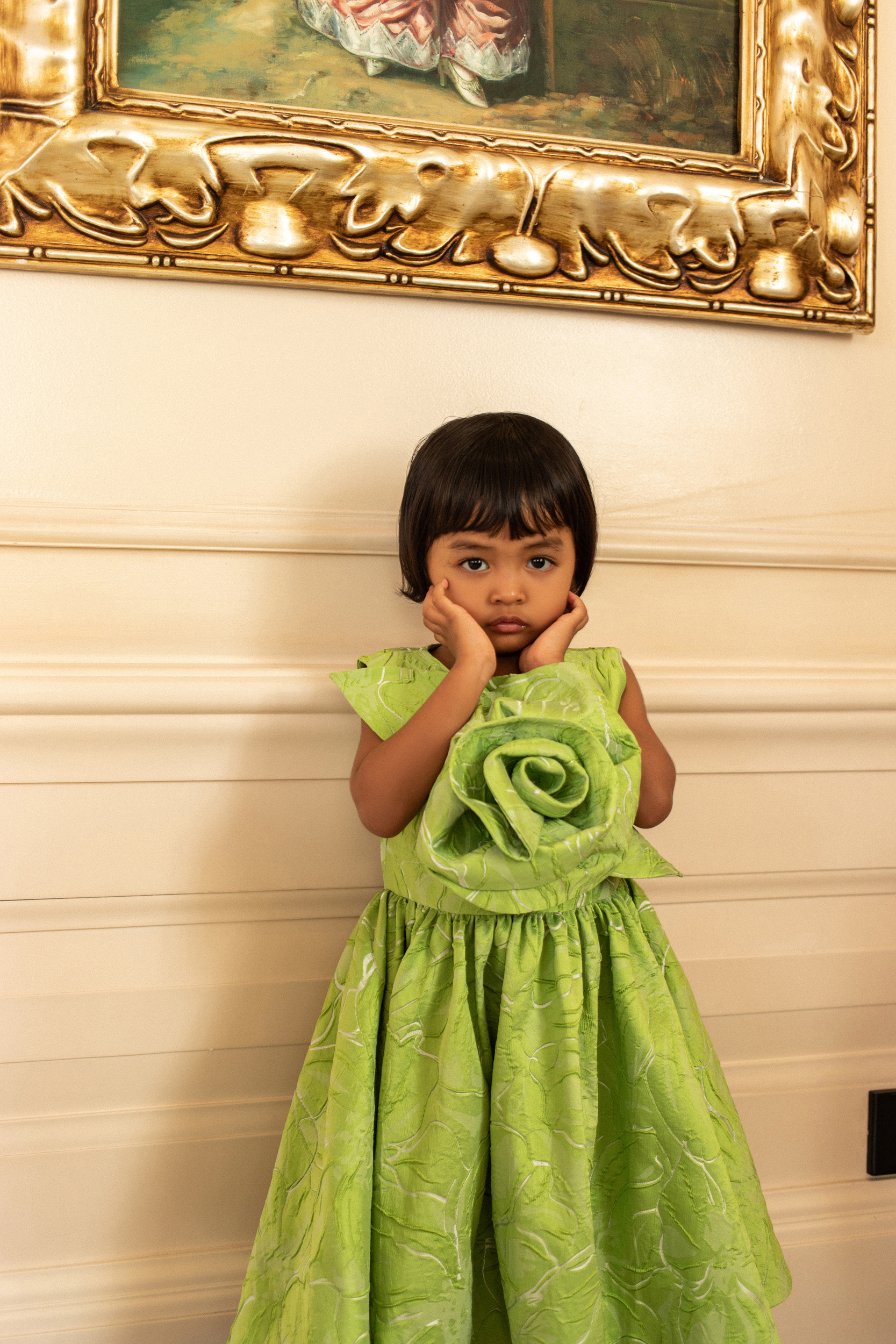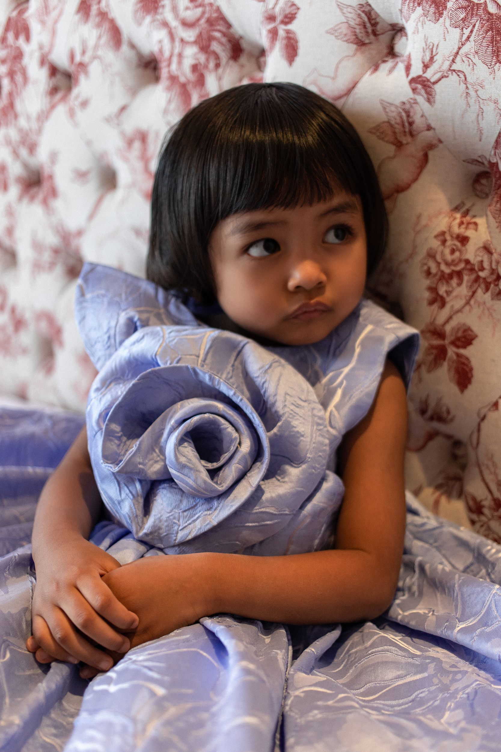 Mới đây, NTK dành tặng cho con gái 6 chiếc váy mới toanh khi chuẩn bị vào hè. Trang phục lấy phom xoè làm chủ đạo, mang đến cảm giác thoải mái. Phần thân váy được tạo điểm nhấn với chi tiết hoa hồng 3D to bản. Nên vải với những hoạ tiết in chìm dập nổi càng giúp mẫu váy thêm phần đặc biệt.