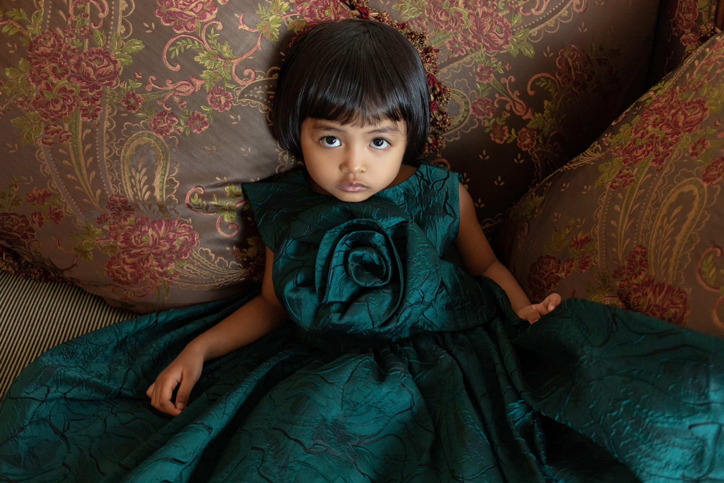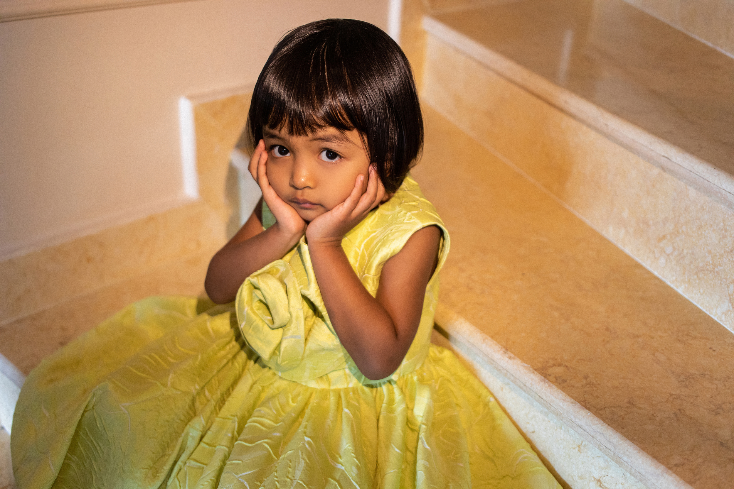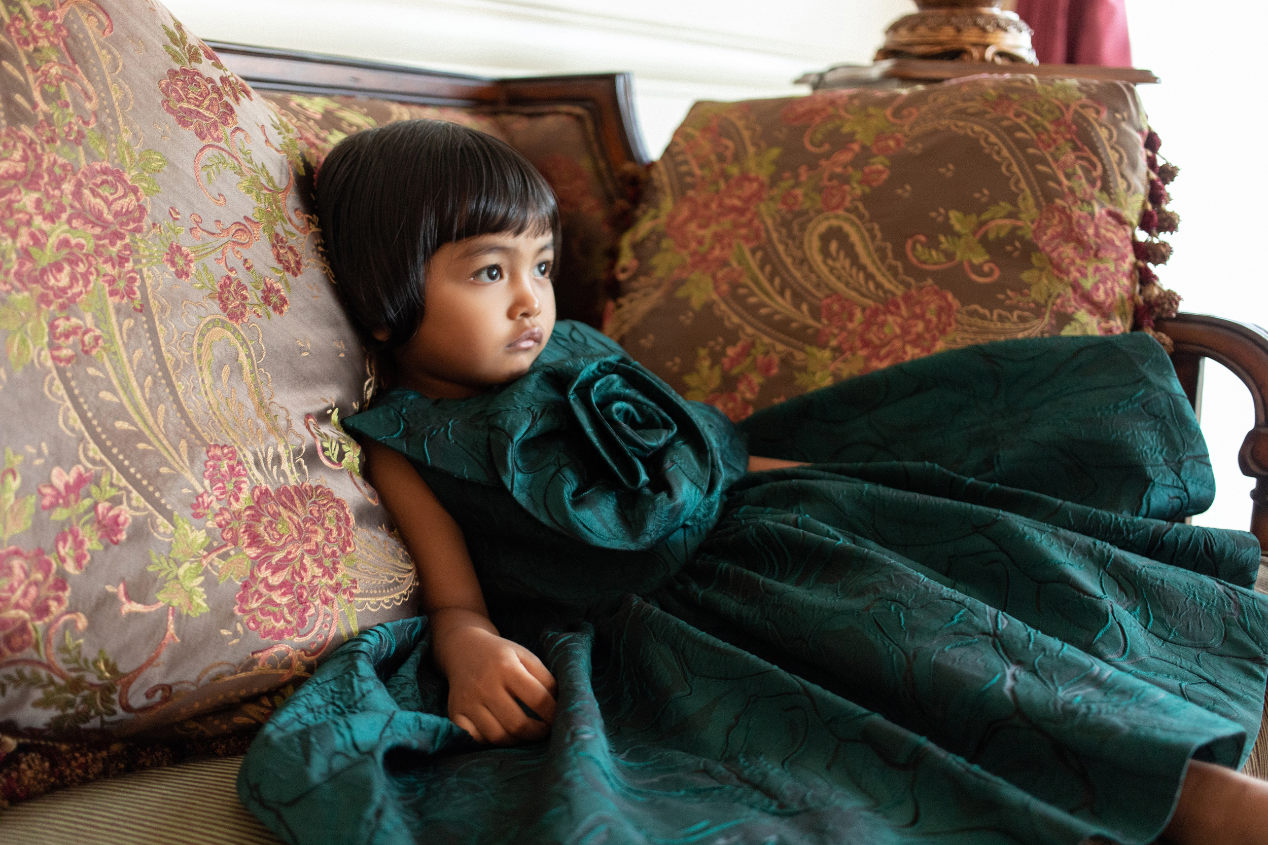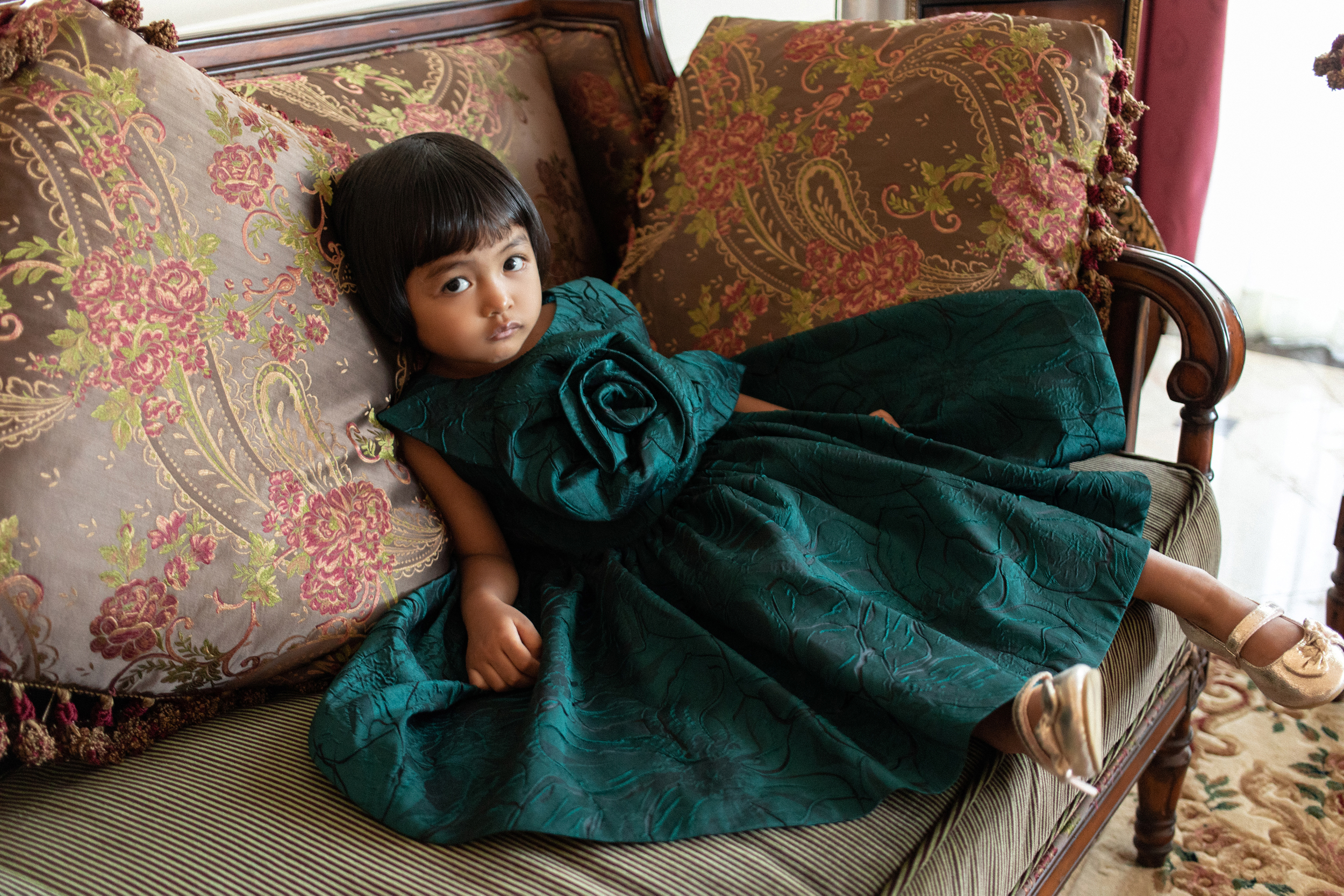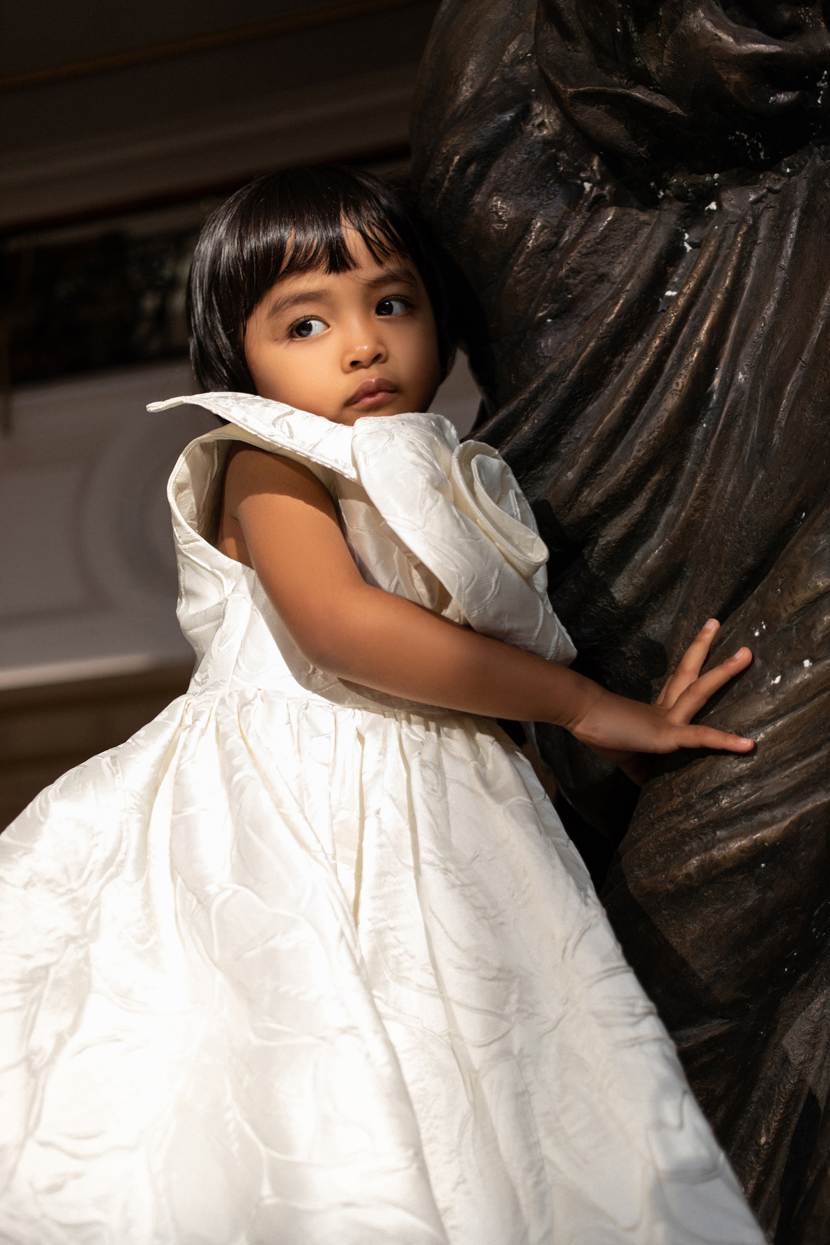NTK lựa chọn nhiều màu sắc cho con như: trắng, xanh lá, xanh ngọc, xanh da trời, vàng, hồng. Các màu sắc đều phù hợp với làn da nâu khoẻ khoắn của Linh Đan. Cô bé tỏ ra thích thú khi liên tục được diện những trang phục mới. Dù mới 3 tuổi nhưng Linh Đan khá dạn dĩ trước ống kính.
