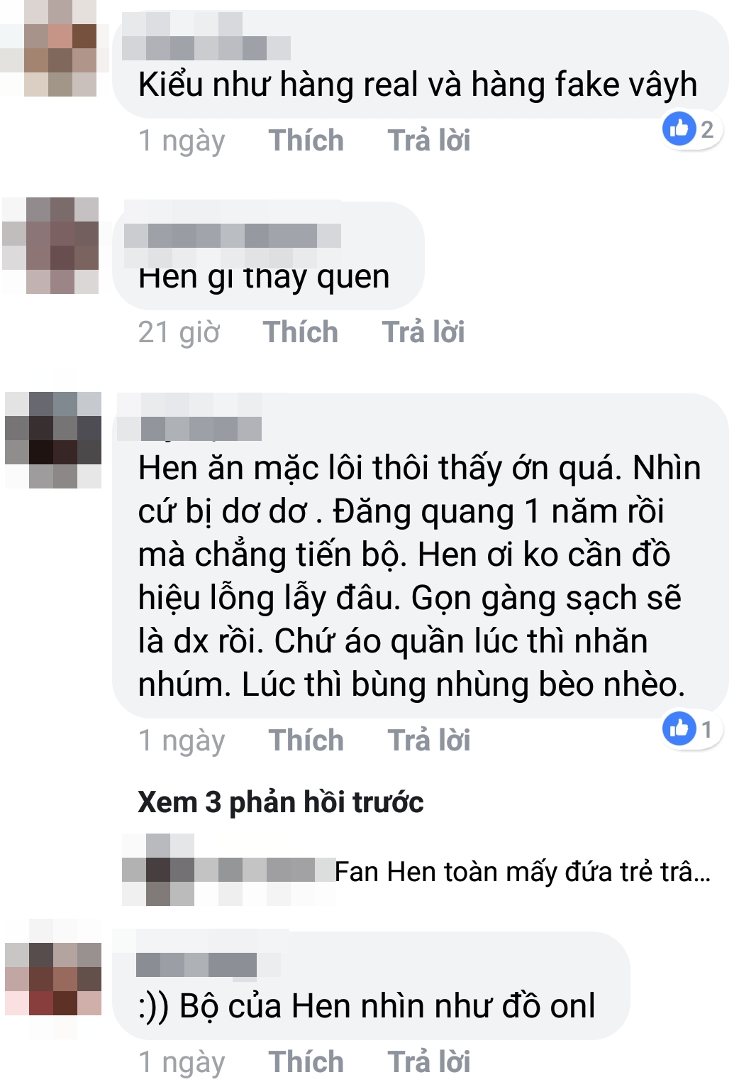 Ngoài bộ cánh cầu kỳ, mái tóc xoăn dài của Hen cũng bị nhận định là khiến cô trở nên già nua, sến sẩm.