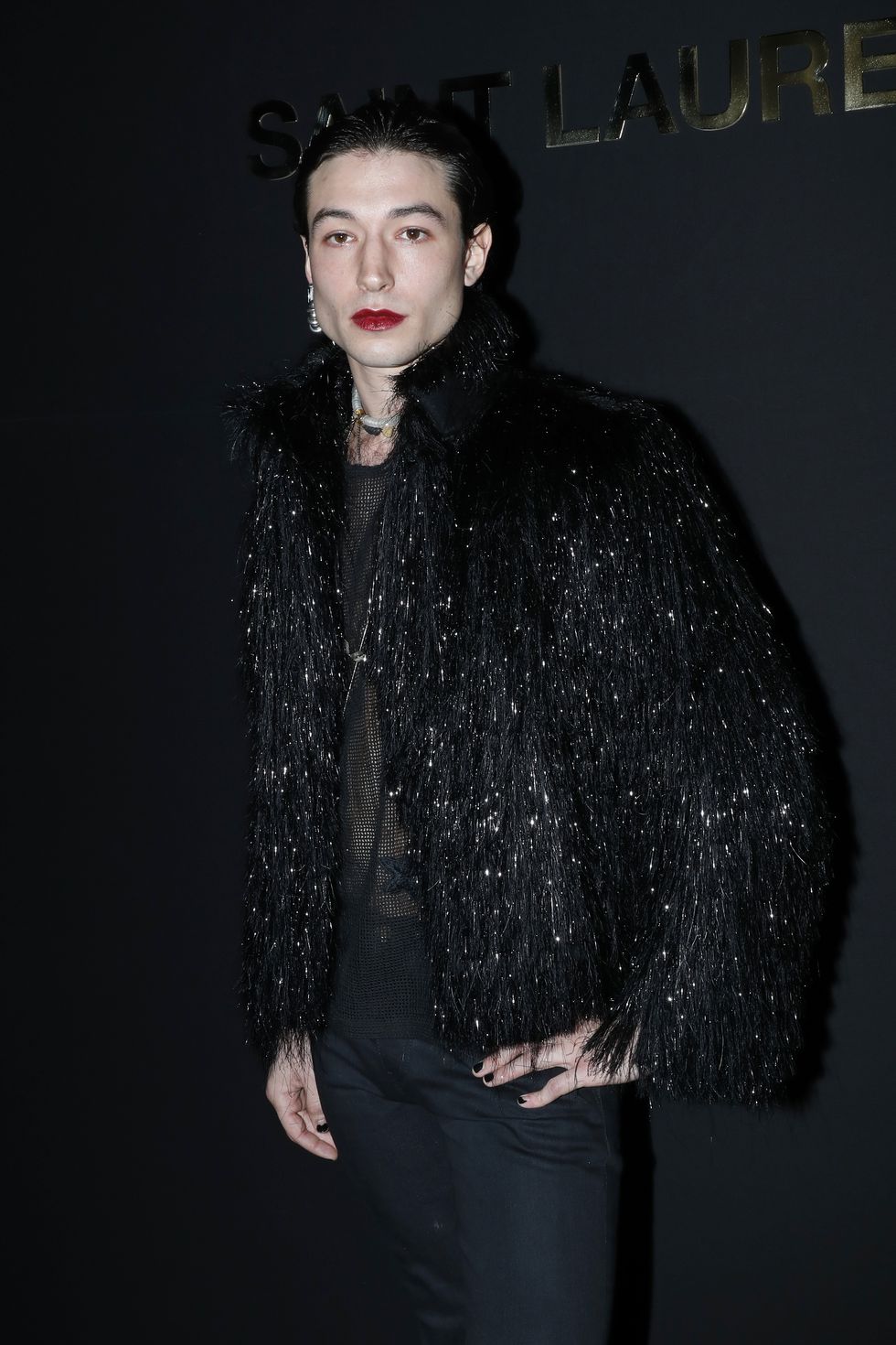 8. Nếu che gương mặt, có lẽ bạn sẽ nhầm Ezra Miller là một nữ minh tinh tại tuần lễ thời trang Paris. Không có lý nào các nàng lại chê chiếc áo lung linh này của Saint Laurent, cánh mày râu cũng vậy.