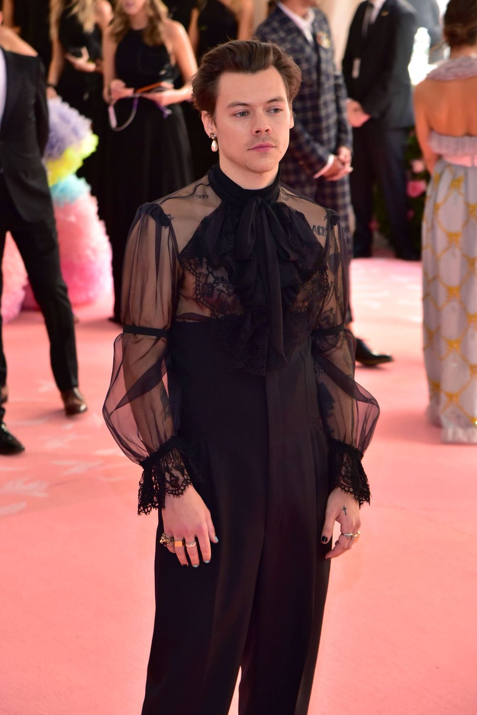 2. Met Gala là sân nhà cho Harry Styles diện áo thắt nơ của Gucci. Nam ca sĩ không quên đánh móng tay màu đen để tiệp màu với trang phục.