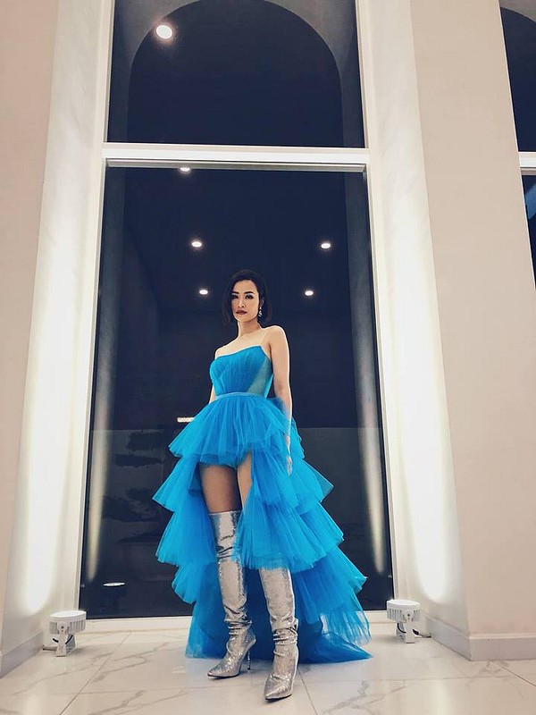 Chiếc đầm dài high-low vô cùng rực rỡ nhưng khi mix cùng đôi boots ánh bạc hầm hố của Đông Nhi lại khiến nữ ca sĩ trông nặng nề thấy rõ.