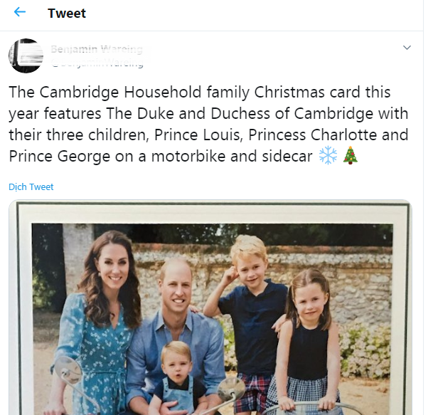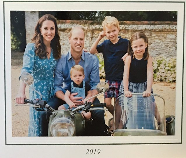 Trong bức ảnh năm nay, hoàng tử William tạo dáng trên một chiếc xe máy, trong khi Kate Middleton, hoàng tử George và công chúa Charlotte đứng hai bên còn hoàng tử bé Louis ngồi trên đùi bố. Theo People, cung điện Kensington vẫn chưa chính thức phát hành bức ảnh nhưng một thành viên công tác tại British Air Force (lực lượng không quân Anh Quốc) đã nhận được thiệp trong tuần này. Đó là một trong những người đầu tiên chia sẻ tấm thiệp hoàng gia trên Twitter.