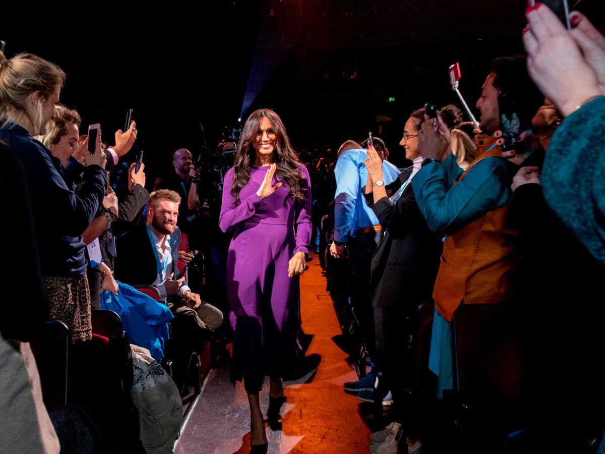Tuy vậy, Meghan Markle vẫn không thể ngừng tình yêu với các trang phục có màu sắc độc đáo. Nữ công tước xứ Suss*x xuất hiện tại lễ khai mạc ‘Hội nghị thượng đỉnh thế giới trẻ’ trong một chiếc váy Aritzia màu tím làm thiên hạ ‘rớt hàm’. Phụ nữ hoàng gia thường chọn các màu sắc trung tính như đen, trắng, nâu, xanh đậm. Nữ hoàng Elizabeth bắt đầu mặc trang phục có màu sáng khi tuổi tác ngày càng cao, để làm giảm các giác ‘âm u’ khi chào dân chúng.