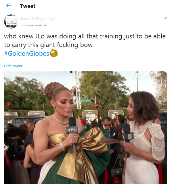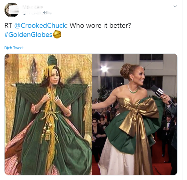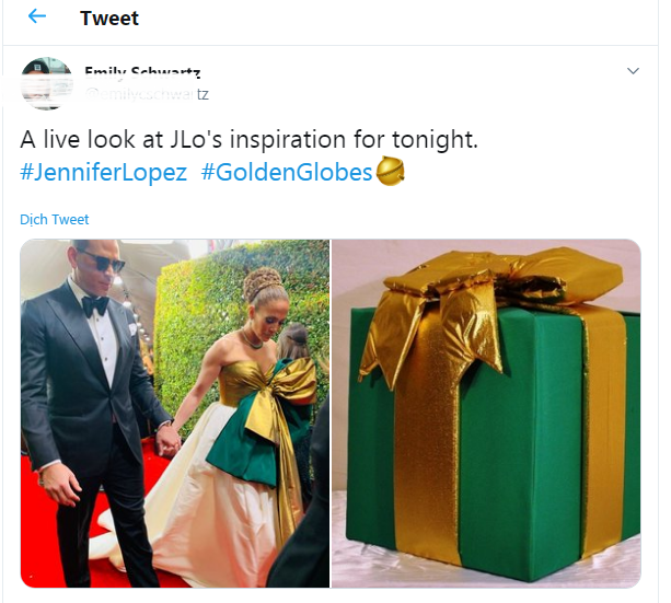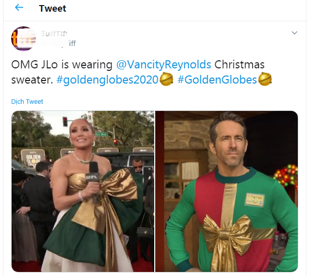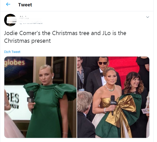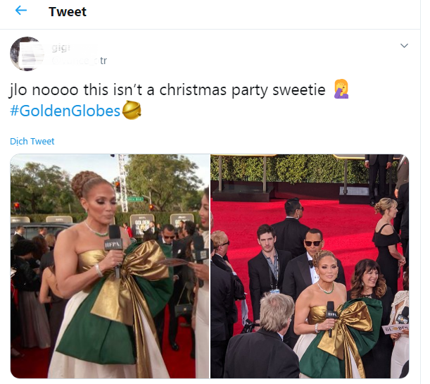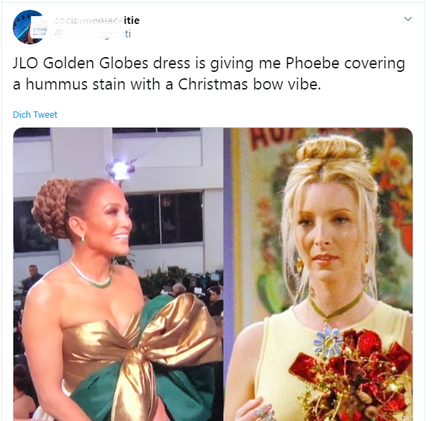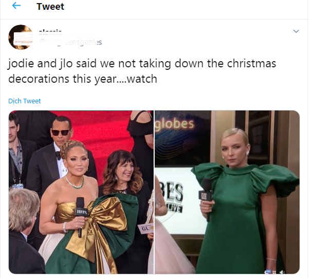 Cư dân mạng và nhiều trang tin tức nổi tiếng đùa rằng JLo giống như một món quà giáng sinh muộn. Tuy vậy, không ai có thể phủ nhận JLo vẫn là cái tên nhận được nhiều sự chú ý nhất thảm đỏ ‘Quả cầu vàng’ năm nay.