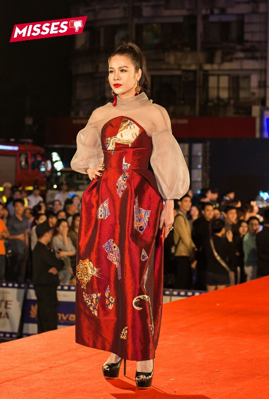 Làm giám khảo tại một sự kiện điện ảnh, Nhật Kim Anh khiến nhiều người hoang mang với bộ cánh họa tiết chất liệu vải taffta nặng nề. Chưa kể form dáng phồng, oversize khiến vóc dáng của nữ diễn viên như bị “nuốt chửng”.