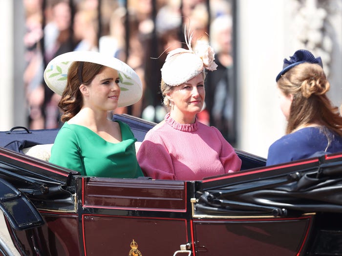 Tại Trooping the Color 2019, Eugenie diện một chiếc mũ đơn sắc gắn hoa khổng lồ.