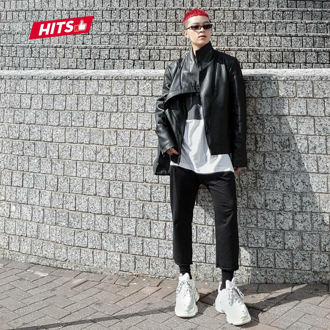 Cùng lựa chọn đôi Balenciaga khi xuống phố, nhưng Kelbin Lei lại mix, match cùng áo khoác da và áo phông trắng. Mái tóc đỏ rực chính là điểm nhấn ấn tượng của anh chàng stylist tài năng với người đối diện.