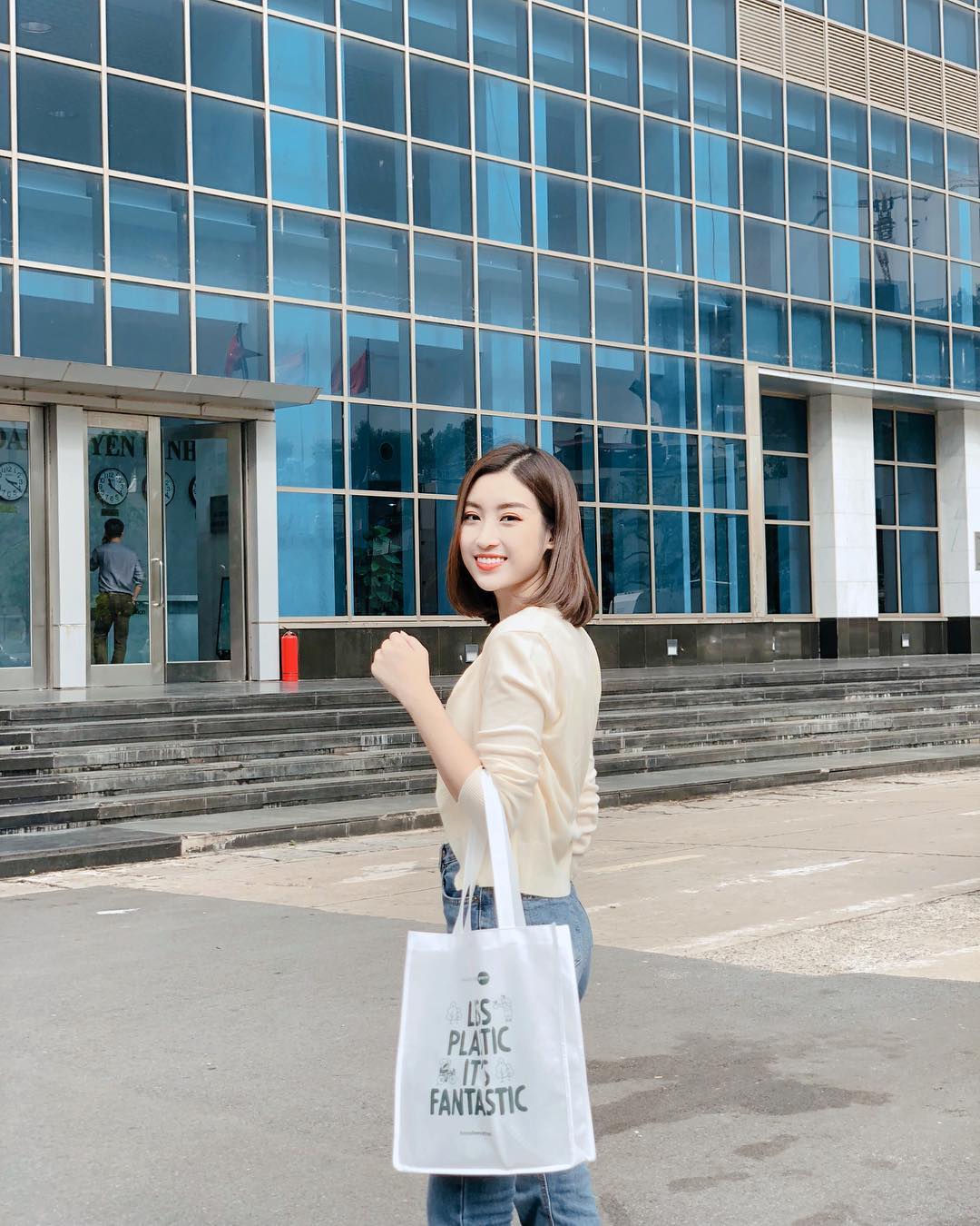Nếu Thu Thảo toát lên sự sang trọng thì nét giản dị, tươi tắn, rạng rỡ lại được Đỗ Mỹ Linh đem đến qua set đồ này: áo len và quần jeans cùng túi tote - những món đồ ghi dấu ấn trong lòng giới trẻ Việt.