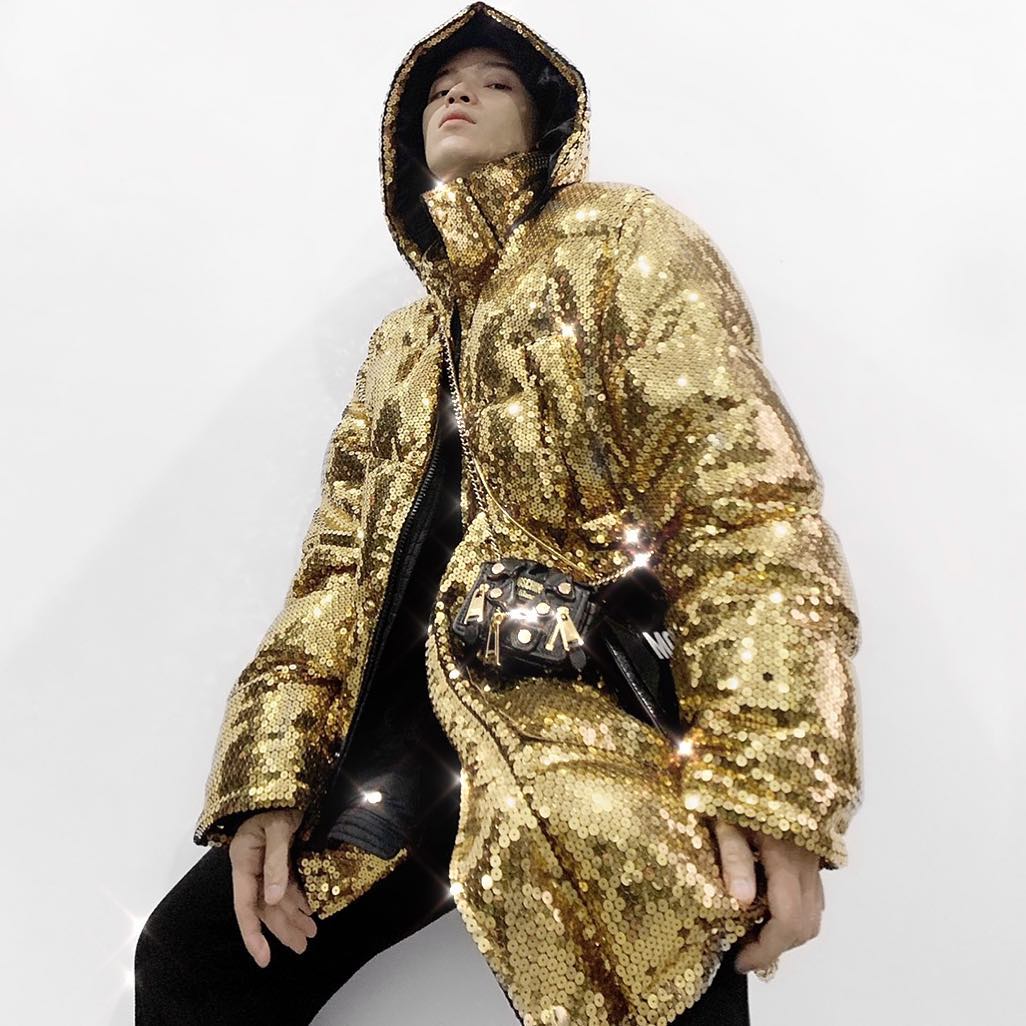 Cùng đam mê xu hướng sequin nhưng Kelbin Lei lại có phần nhỉnh hơn khi diện cả cây đồ của H&M kết hợp cùng Moschino xuống phố.
