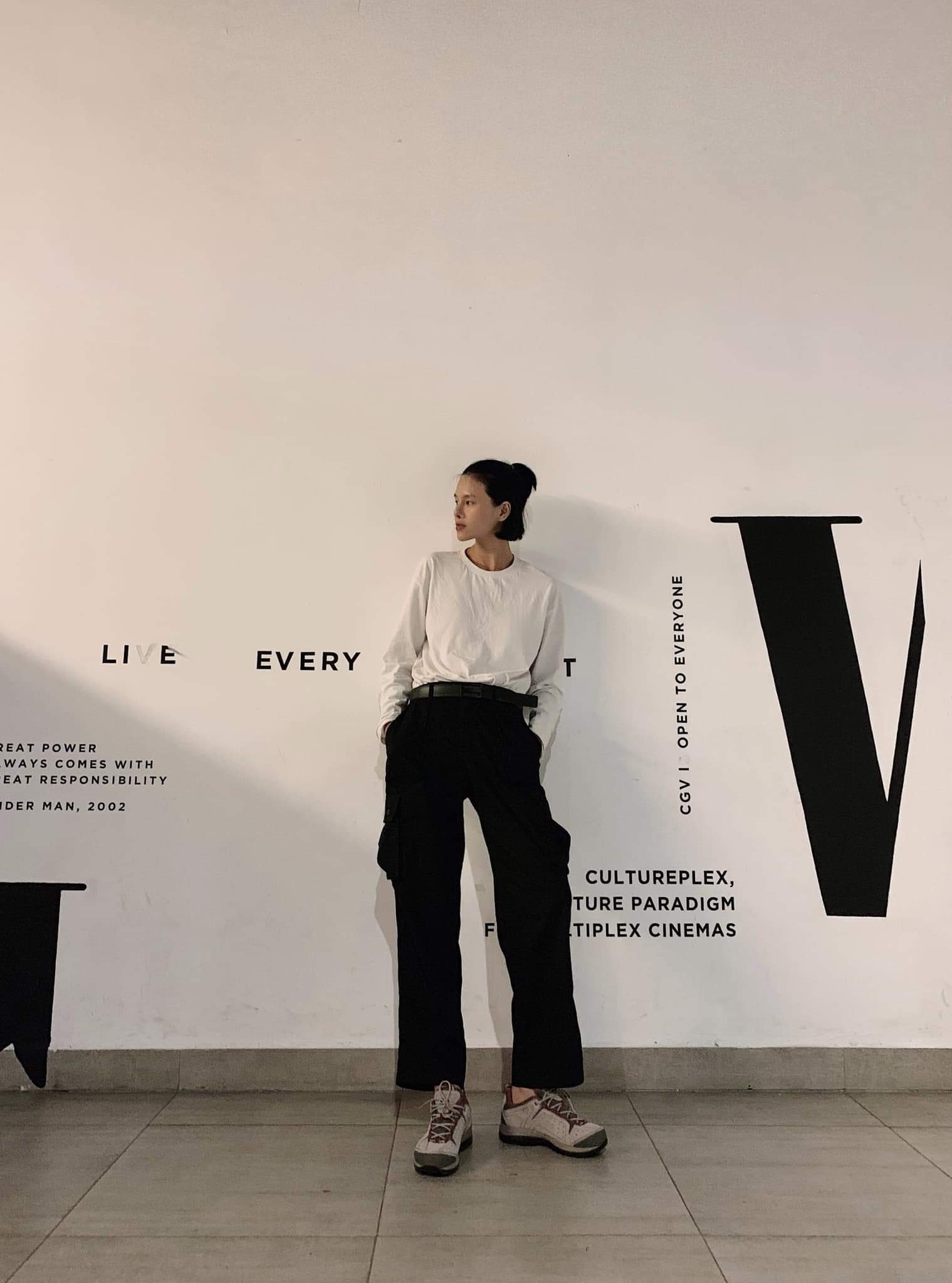 Chiếc quần dài cá tính mix cùng áo phom rộng giúp chân dài Hà Kino khoe được hết lợi thế hình thể của mình.