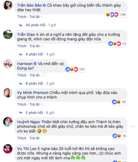 Ngay phía dưới bình luận, không ít đồng nghiệp cùng các fan ùa vào trêu chọc danh hài. BB Trần nô giỡn với người bạn thân thiết của mình: “Cà kheo bây giờ cũng biến tấu thành giày dép hay thiệt”. Trong khi đó, fan lại bảo rằng: “Nếu thấy cuộc sống chông chênh, hãy tháo giày ra…” và thậm chí còn cả: “Nên tặng lại đôi giày cho Trường Giang anh nhé…”