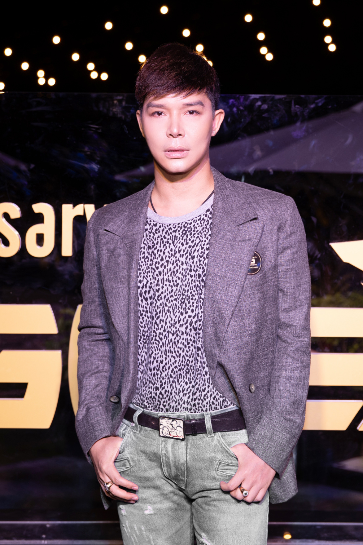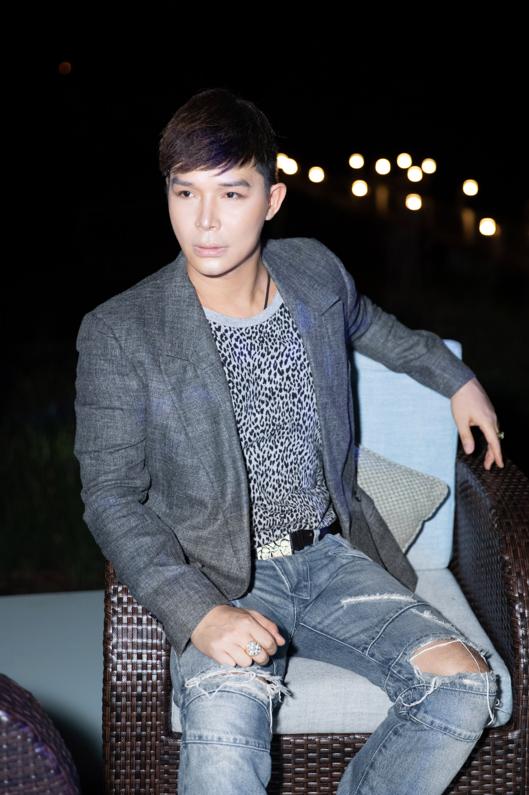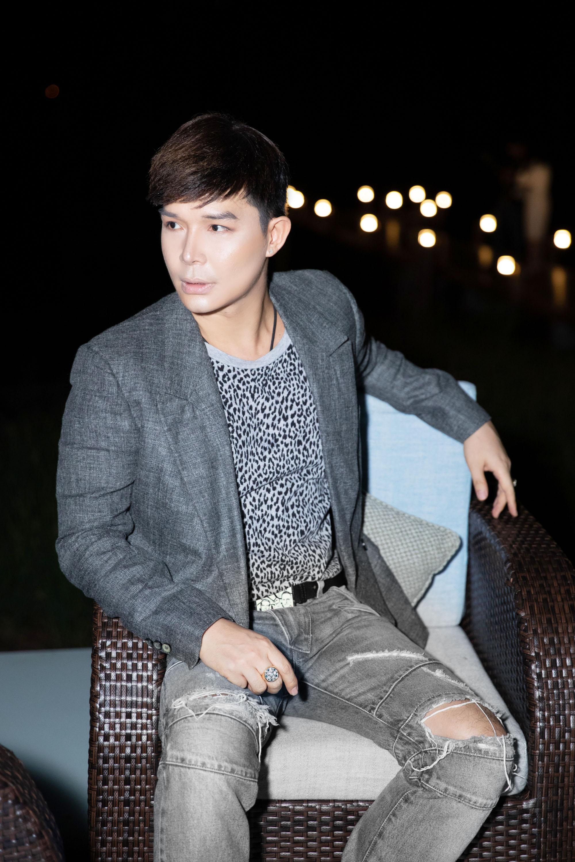 Chọn cho mình bộ cánh đơn sắc với vest mix cùng áo phông họa tiết da động vật cùng quần jean rách, Nathan Lee trông cực kỳ điển trai, trẻ trung hút mắt.