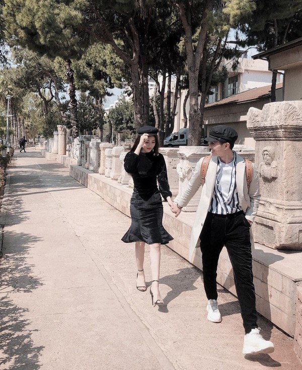 Bộ đôi từng nhiều lần vui vẻ xuất hiện bên nhau, đồng thời diện trang phục đồng điệu, đơn cử như chàng áo vest lịch lãm, nàng là váy trắng thướt tha.