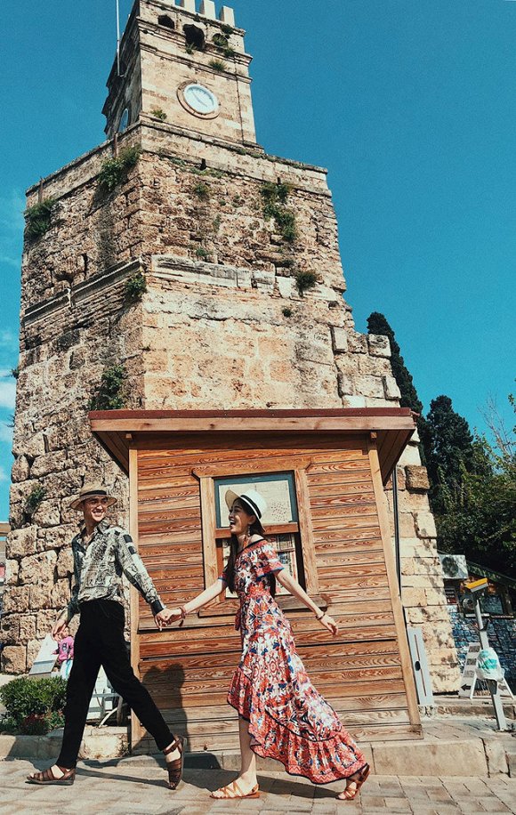 Dạo chơi tại xứ bạn, cả hai tay trong tay cùng outfit tương đồng. Tuy họa tiết không giống nhau nhưng nhìn chung đều có sự liên quan cả về màu sắc lẫn chất liệu.