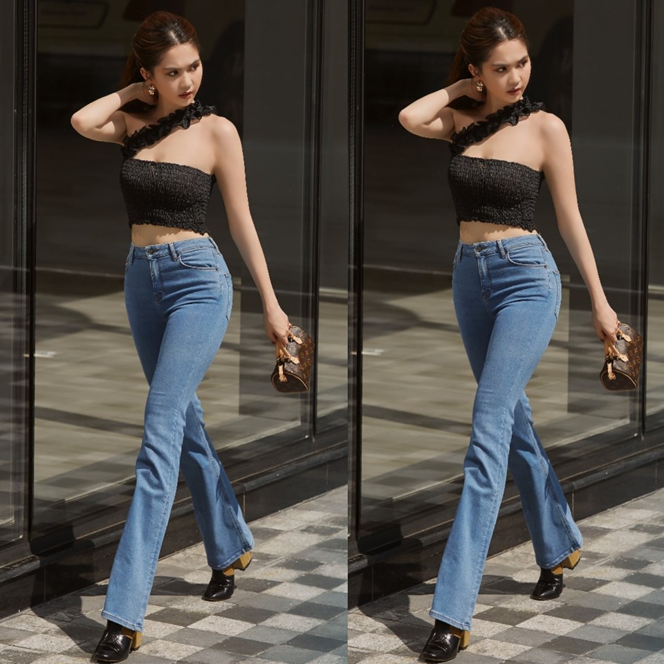 Cũng theo đúng cách phối đồ cân bằng bố cục, nếu chọn quần ôm, Ngọc Trinh sẽ diện cùng áo phom rộng, khiến tổng thể trở nên cuốn hút.