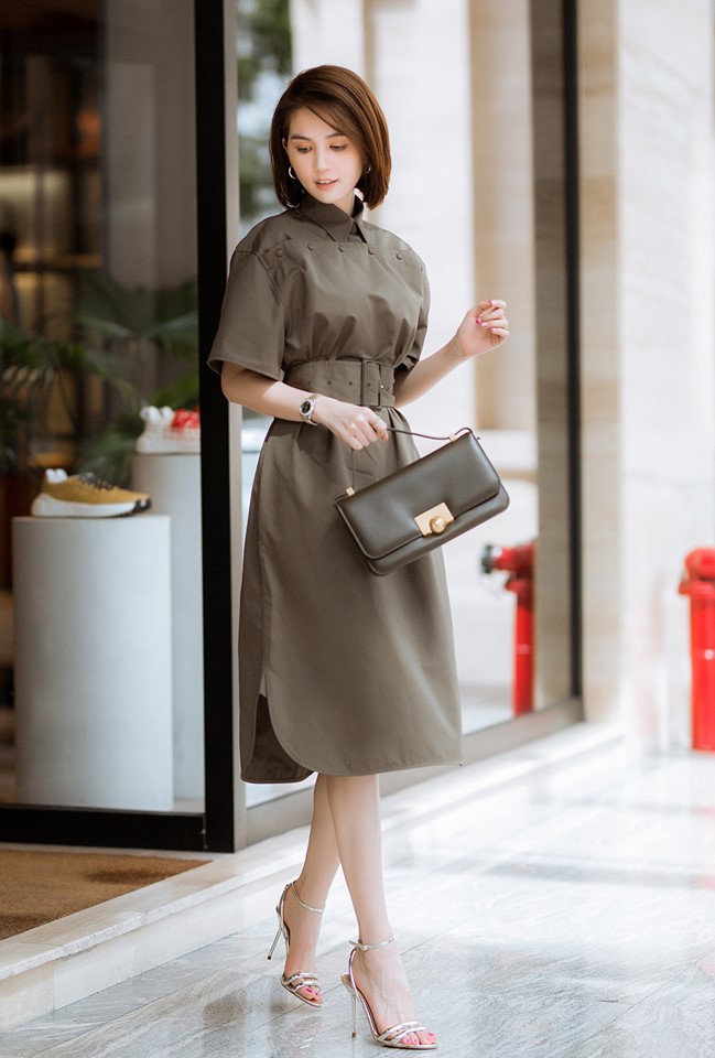 Váy sơ-mi mang tông màu nền nã là một trong những item được Ngọc Trinh chọn khi cần đến phong cách thanh lịch.