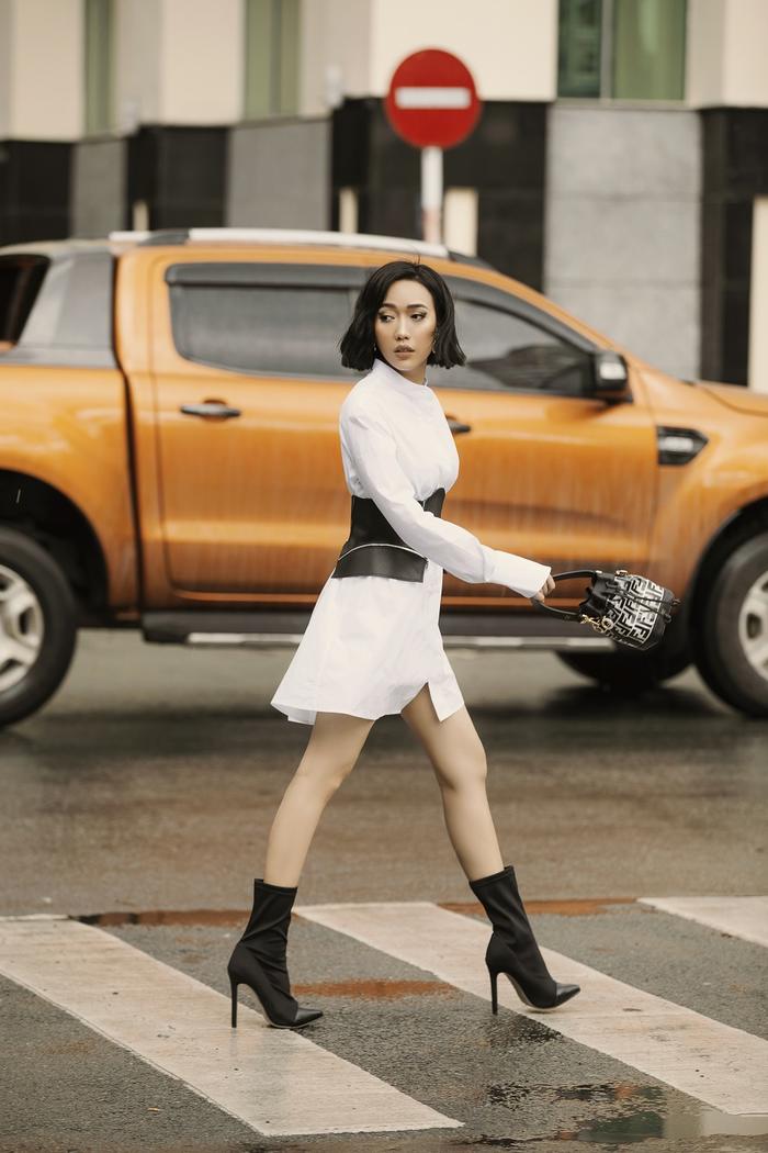 Mix trang phục theo phong cách đồng tông, all-white là một trong những xu hướng đang thịnh trên thế giới, thế nên không có lý do gì Ngọc Trinh bỏ qua được.