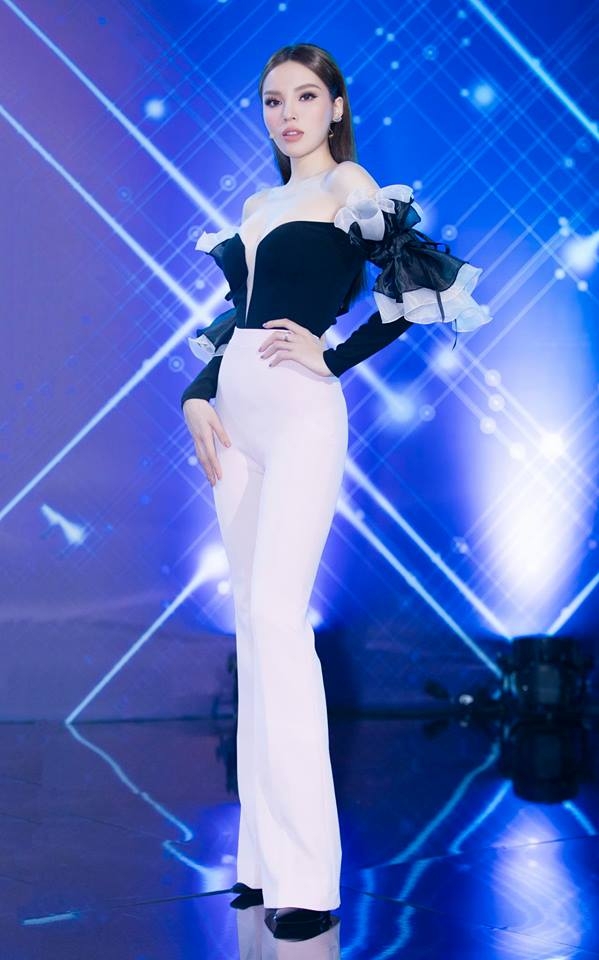 Không chưng diện đầm dài như những người đẹp khác, Kỳ Duyên chọn set đồ gồm áo trễ vai cùng quần ống suông, tôn đôi chân dài tít tắp. Chi tiết cúp ngực cũng giúp cô khoe khéo đôi gò bồng đào căng đầy.